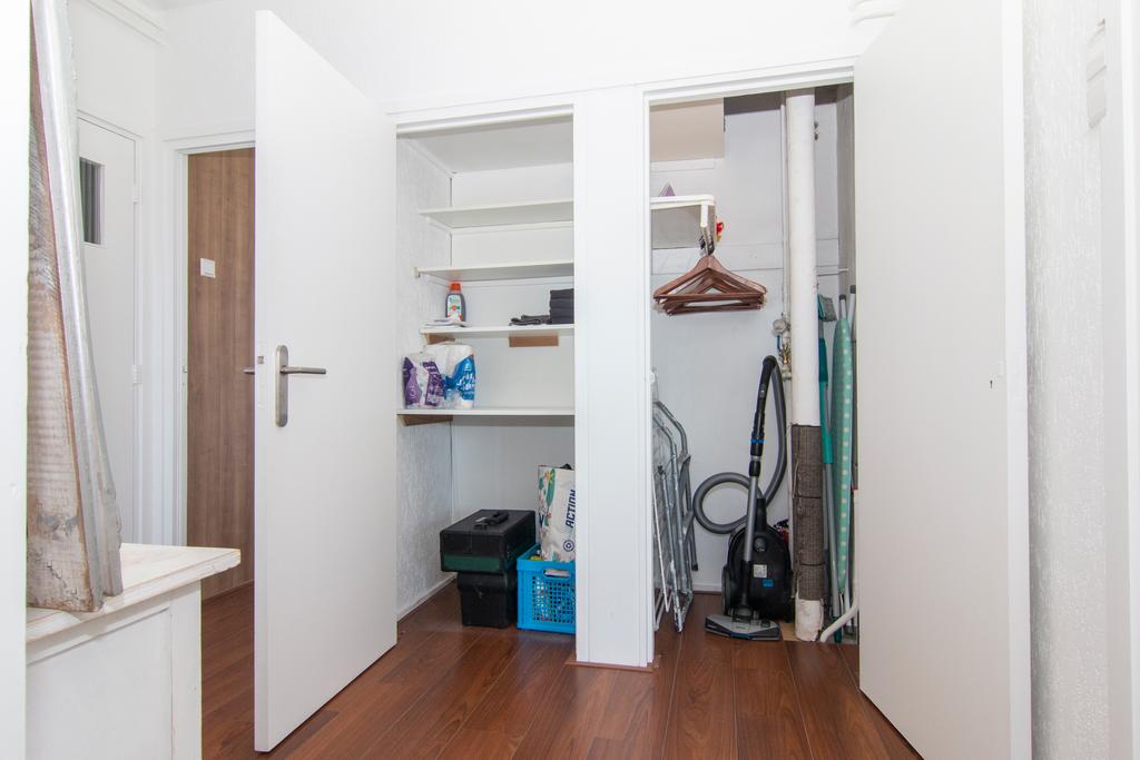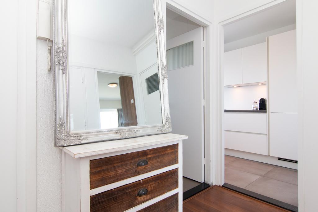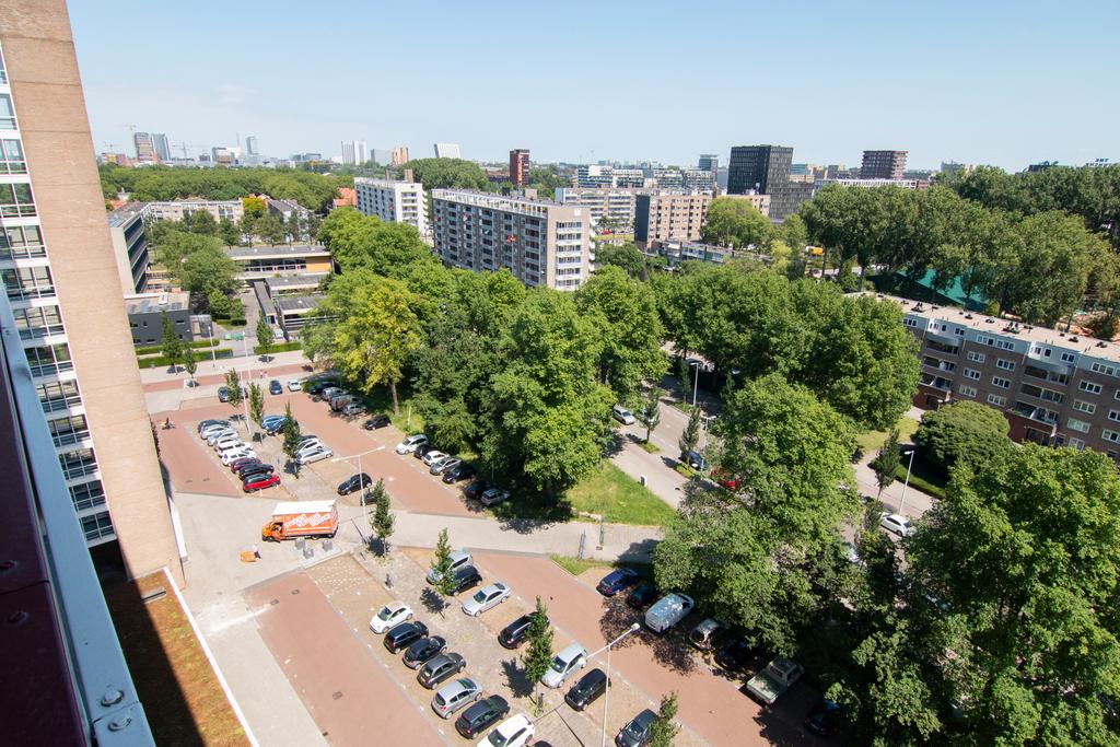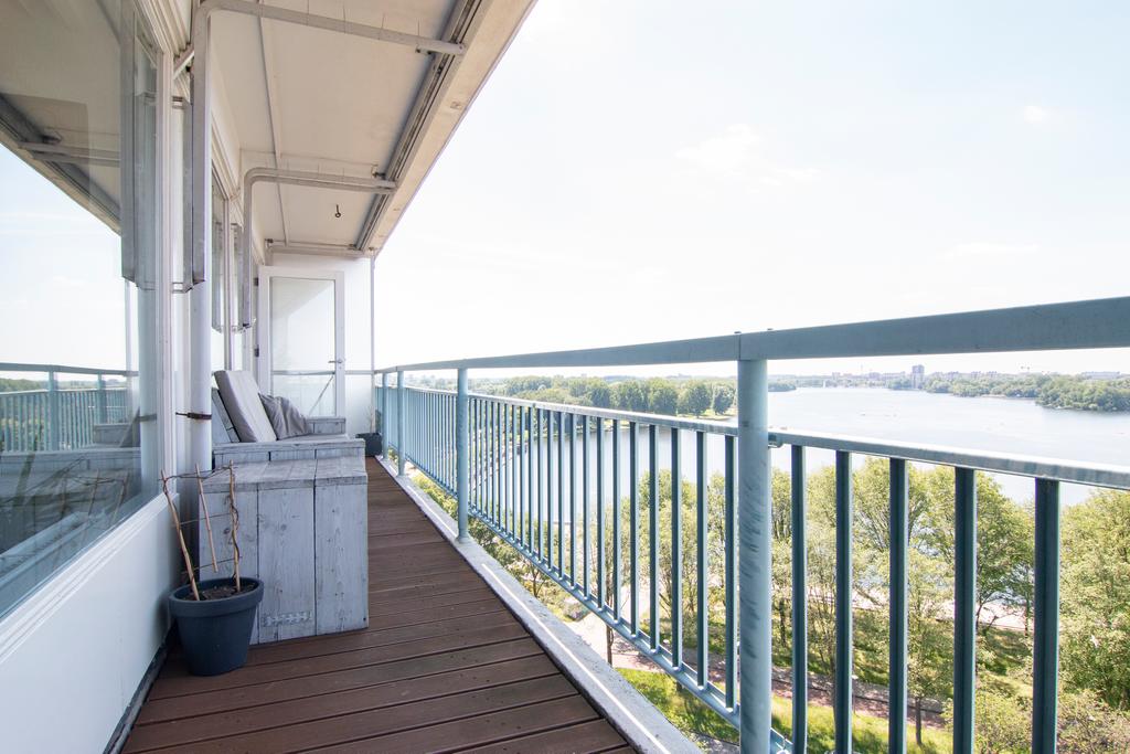 Communal (secure) entrance area with mail boxes, elevator to the 11th floor, entrance, hallway, spacious and bright living with stunning view, separate kitchen equipped with; fridge, freezer, combi oven, induction stove and dishwasher, bathroom with sink, shower, design radiator, washer and dryer, master bedroom at the rear with double bed and wardrobe, second good sized bedroom at the front with 2 single beds (can be removed) and wardrobe, large balcony accessible from both the living and the master bedroom overlooking the Sloterplas area