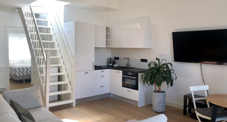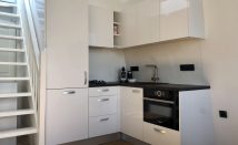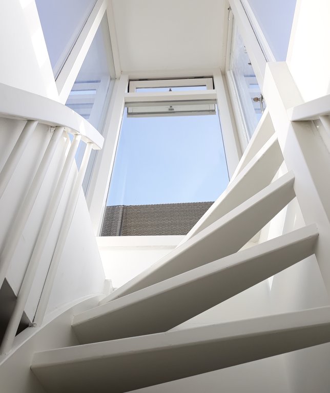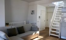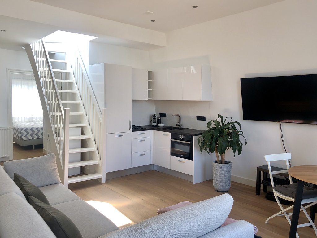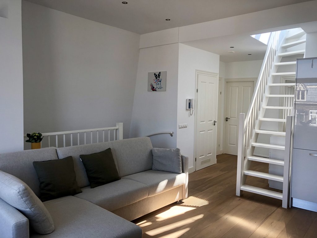 Communal entrance with staircase to the third floor, private hall with wardrobe space and stairs leading to the top floor. At the top you immediately enter the bright and airy living room with open kitchen. The kitchen has been fully renovated and is equipped with dishwasher, gas stove (2 burners), oven/microwave combination and a fridge with freezer.