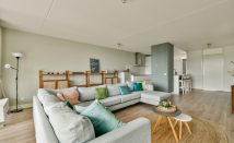 At the front you’ll find the nice and bright living room with a view over the water. The kitchen is located in the middle of the apartment and a dining area is located in the back next to the kitchen.