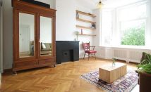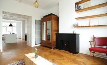 The high ceilings and the herringbone wooden floor determine the attractive appearance.