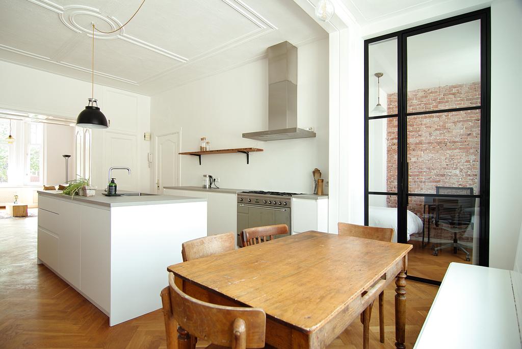 Communal entrance, stairs to second floor, wardrobe area, bright en-suite living including built in storage space, home office/room at the front with wardrobe and washing machine, modern bathroom with charming Portugese tiles, shower, sink and toilet, open kitchen equipped with island, large gas stove including proper oven, fridge, freezer and dishwasher, cosy bedroom at the quiet rear with steel frame door and stylish brick wall.