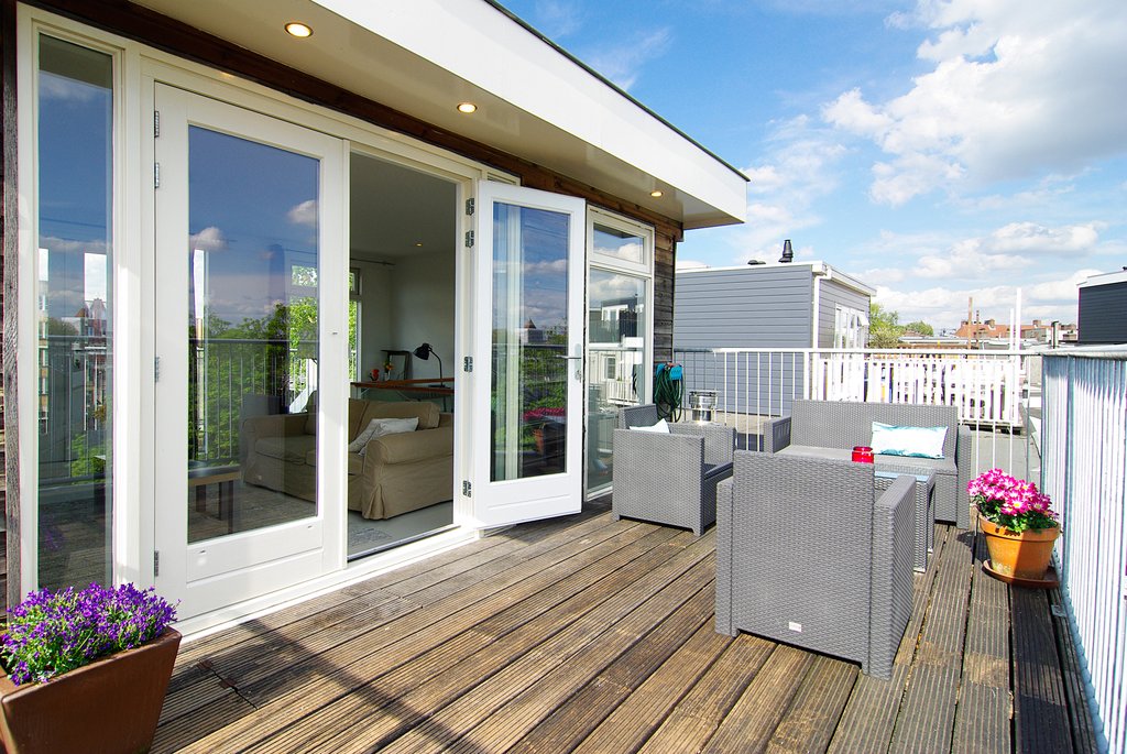 A modern open staircase leads to the top floor with an extra living room (incl. sofa bed) and direct access to a balcony and a roof terrace – the perfect place to relax with wide views over the neighborhood.