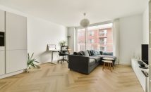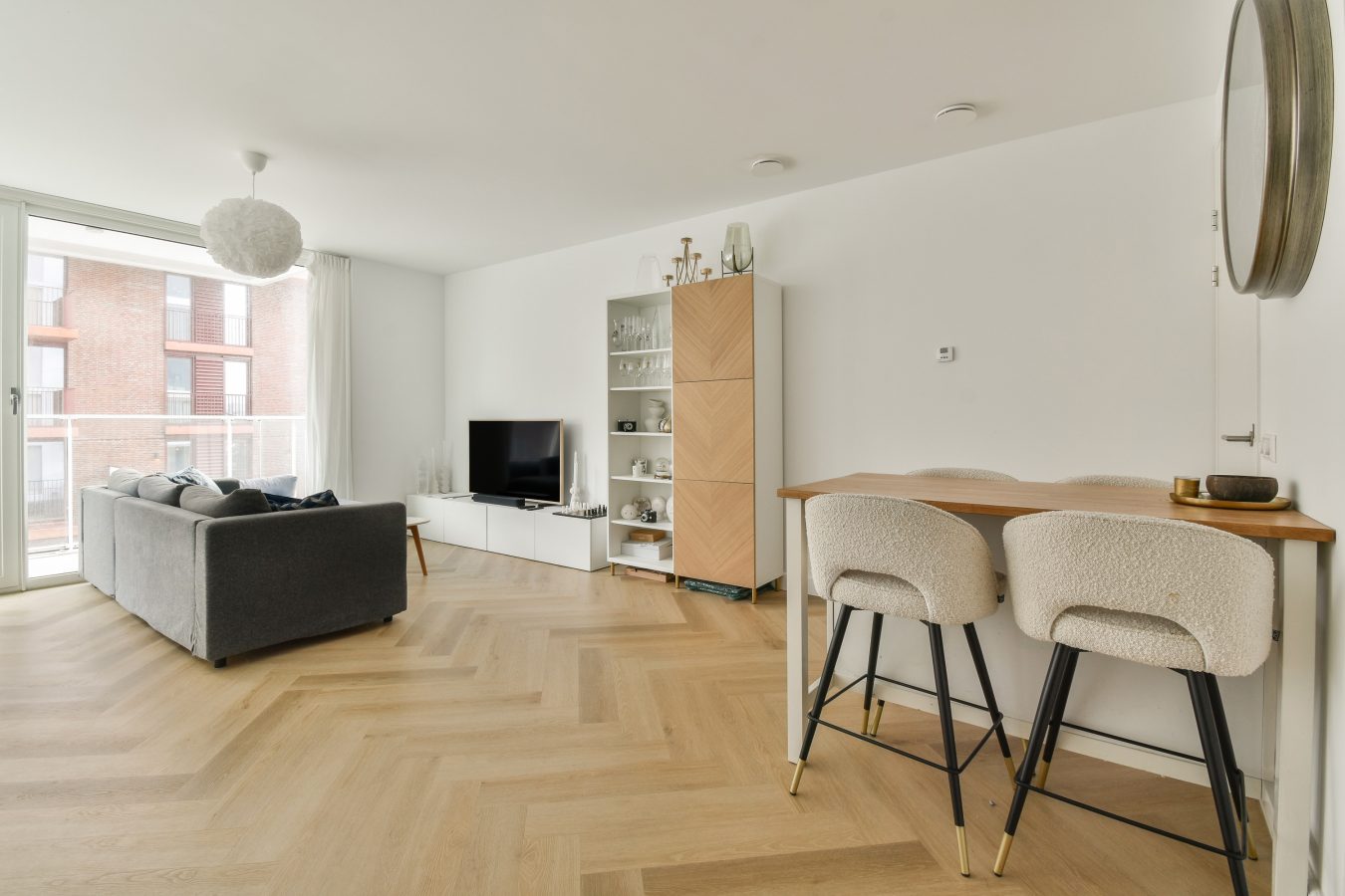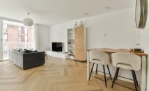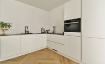 The apartment features a PVC herringbone floor and equipped with a modern kitchen, bathroom, and toilet.