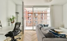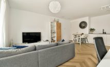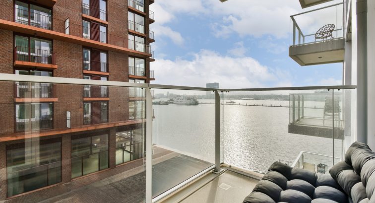 The living room has floor-to-ceiling windows that provide access to the balcony, perfect for enjoying the sun while overlooking the IJ River.
