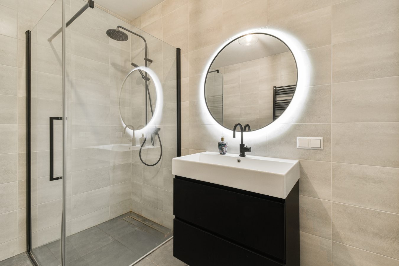 Second floor: hall/entrance with meter cupboard and utility room, toilet with basin featuring modern tiling, bathroom with built-in shower and double sink.
