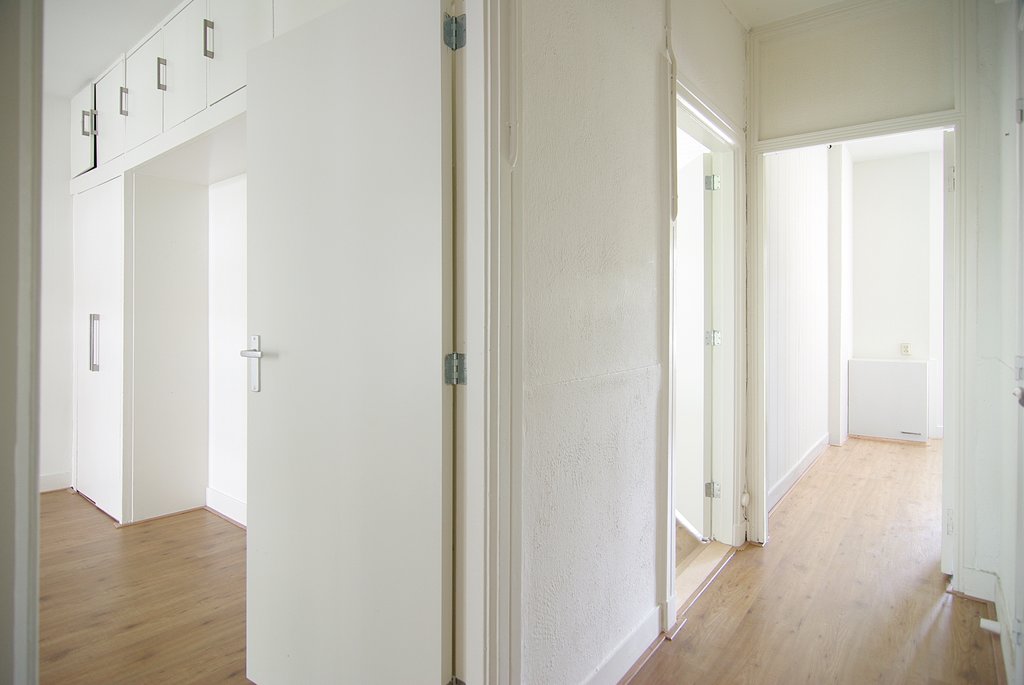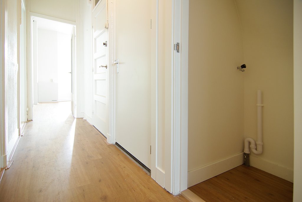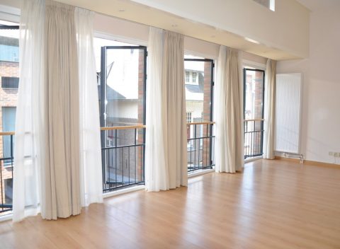 Private entrance, stairs to first floor, hallway with access to all areas, separate toilet, laundry area with connection for washer/dryer, bright living space at the front with beautiful view over the square, modern corner kitchen at the back with fridge, dishwasher, combi oven and gas stove and space for a small(breakfast) table, bathroom with separate shower and double sink, spacious bedroom at the rear with lots of built in cupboard space and attached a balcony with morning sun, second spacious bedroom at the front