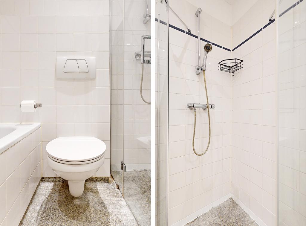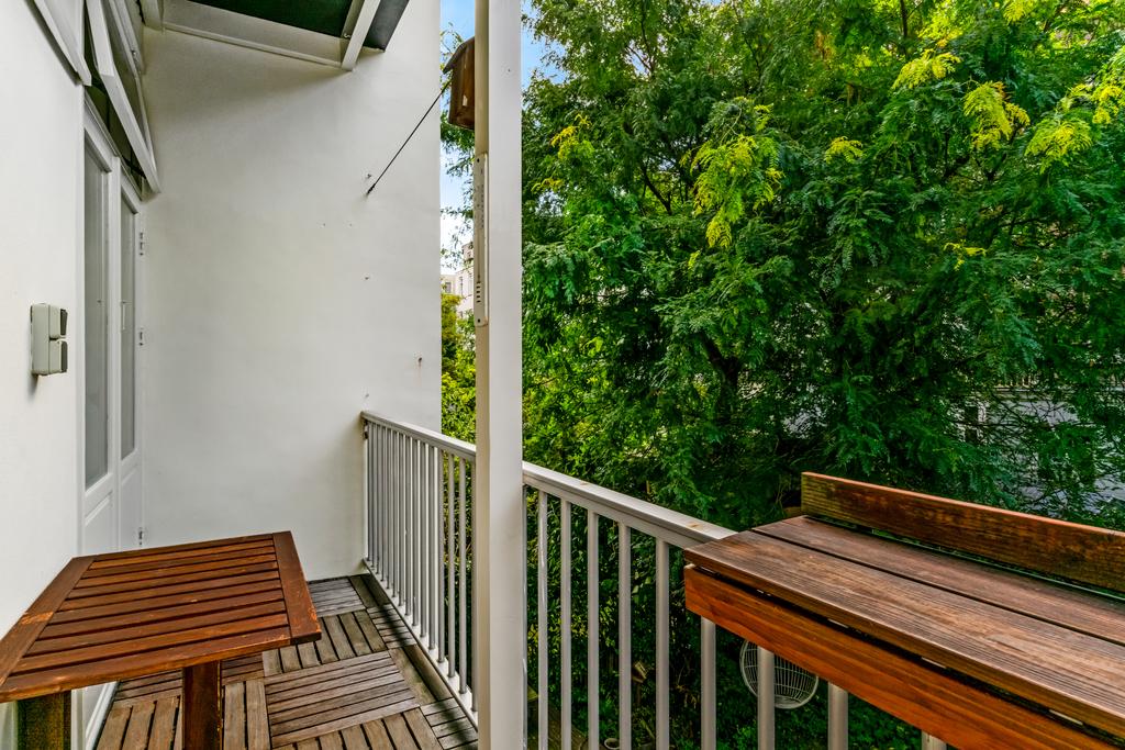 Communal entrance, stairs to first floor, hallway with coat hanger area, bedroom at the front with wardrobe and black out curtains, bathroom with bath, shower, sink, towel heater and toilet, acces to the bright and spacious living area with built in storage closets in the middle, cosy balcony with late afternoon sun at the front, fully equipped semi open kitchen with; gas stove, fridge, freezer, dishwasher, and oven, access to the sunny balcony facing South at the rear side, second bedroom with washer & dryer.