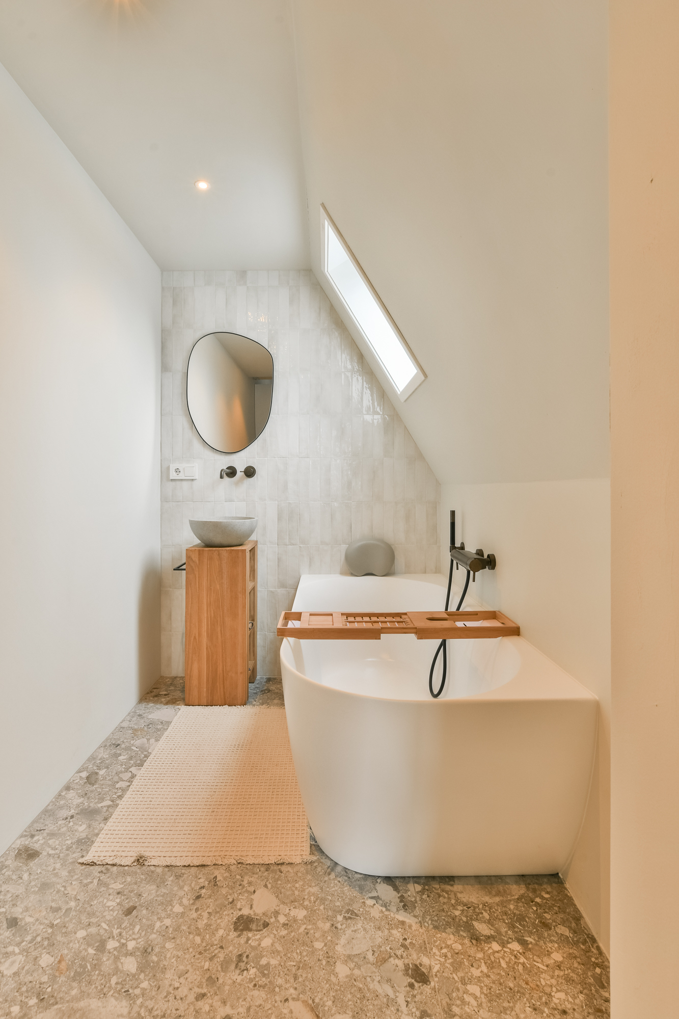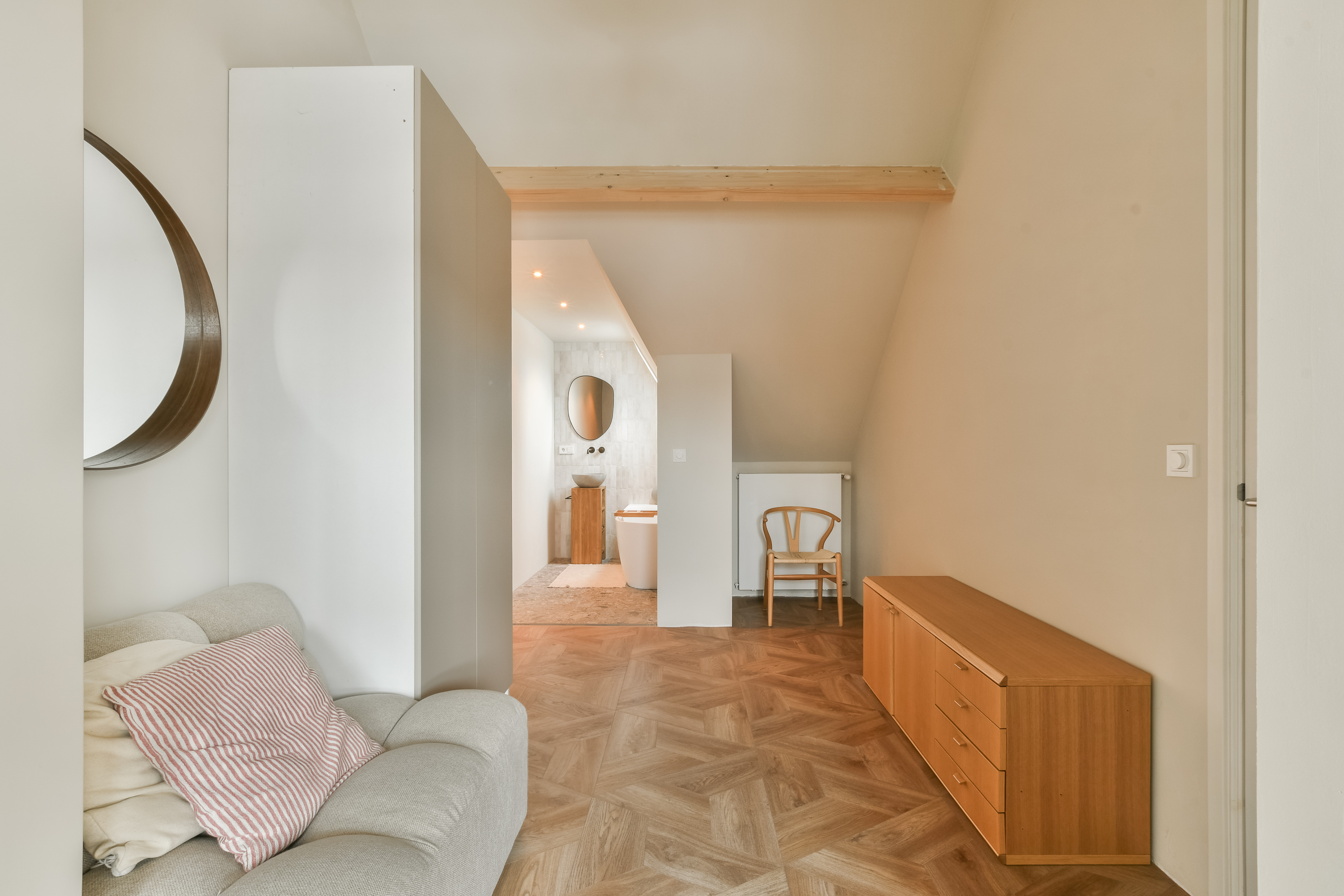The staircase leads you to the second floor with the spacious master bedroom of the house with en-suite bathroom equipped with a bath and a sink.