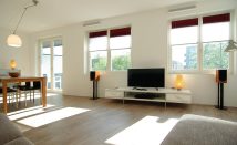The fully furnished apartment has been renovated in 2020 and supplied with new flooring, including floor heating, new bathroom with king size bath, separate shower and sink. There is a well sized master bedroom with double bed and a smaller bedroom with sofa bed and desk. The living room faces the canal and gives access to the sunny balcony. Kitchen supplied with all built in appliances.