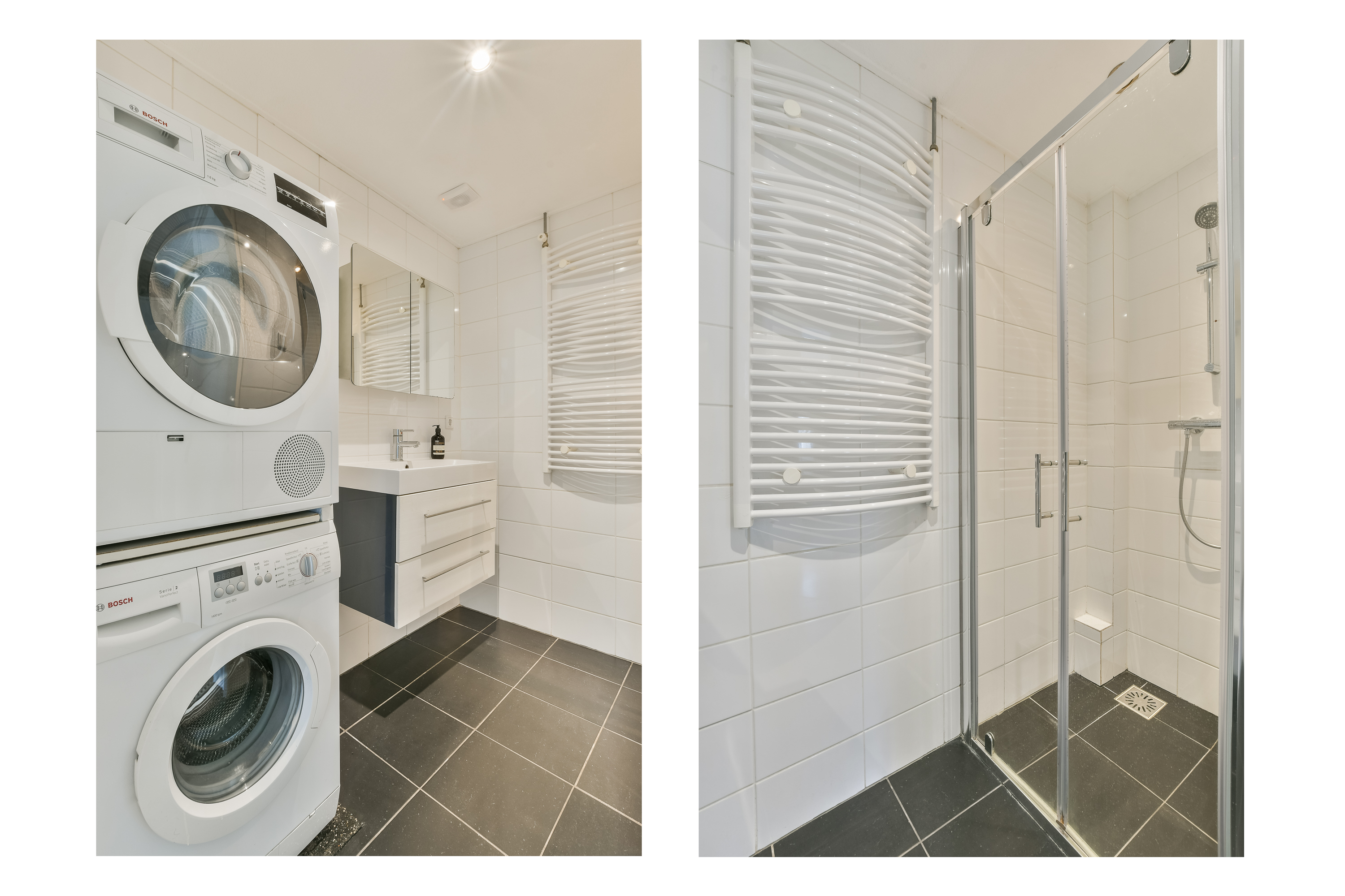 Bathroom with shower, sink, washer and dryer. Separate toilet.