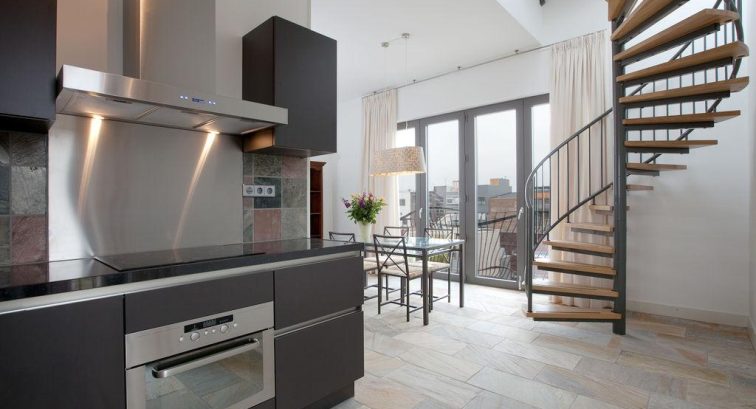 On the third floor is bright living room with dining area and modern fully equipped kitchen. Spiral stairs take you to the huge roof terrace.