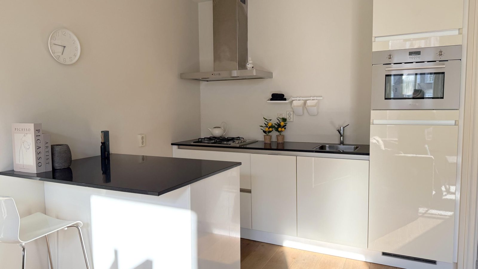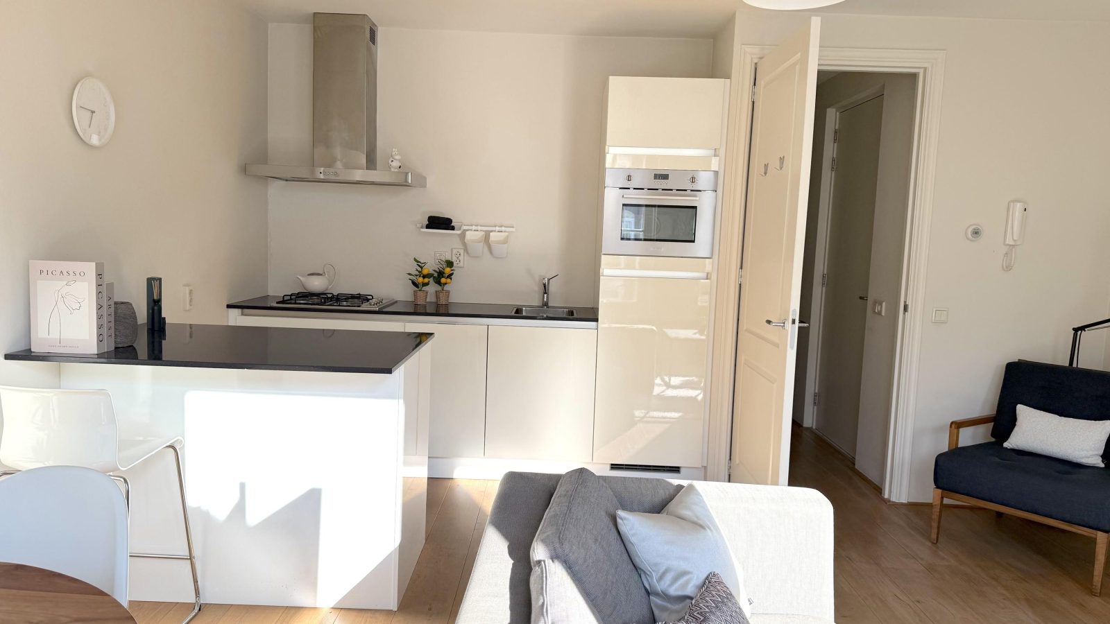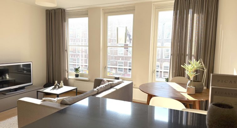 The apartment is located on the second floor and features a spacious, bright living room thanks to three large windows, with views over the always lively Albert Cuyp Market. The open, modern kitchen is equipped with a 4-burner gas stove, dishwasher, fridge with freezer compartment, and a kitchen island with bar.