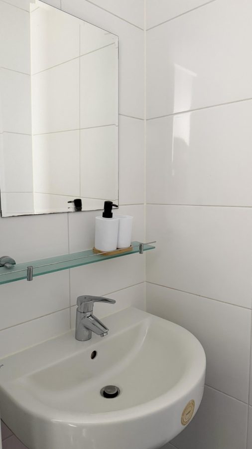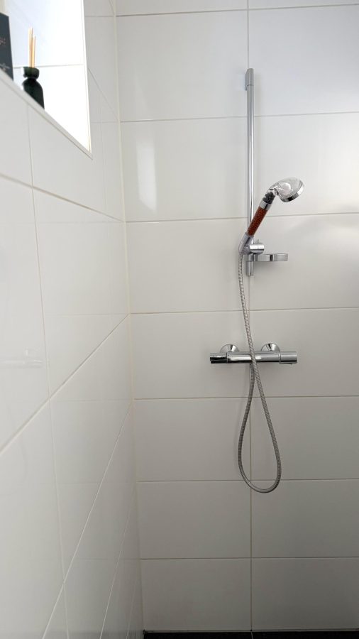 De badkamer is eenvoudig maar functioneel, met een inloopdouche aan de ene kant en een wastafel aan de andere kant. Daarnaast is er een aparte wasruimte voor wasmachine en droger, met extra opbergruimte.