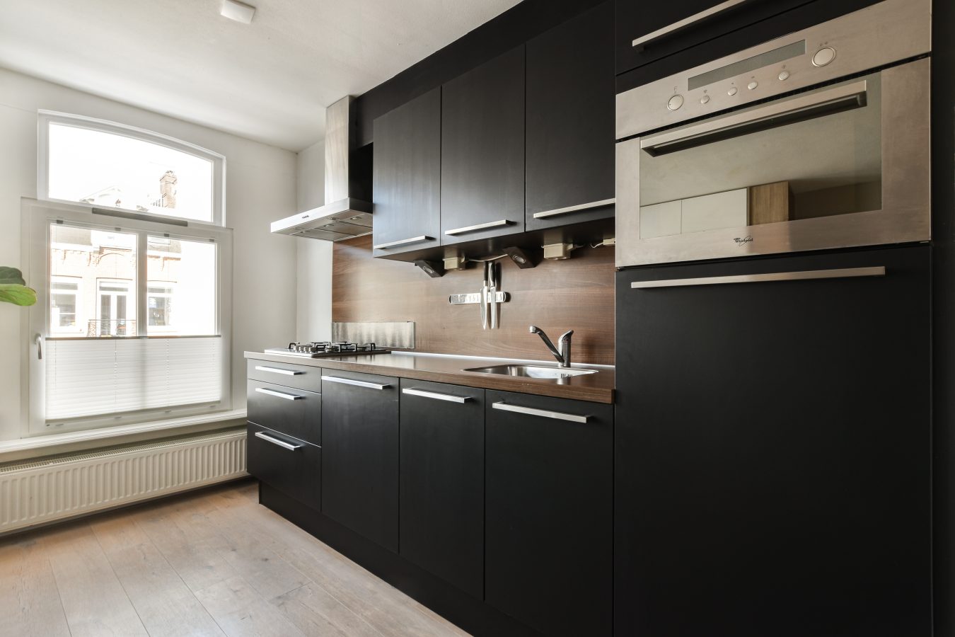Het appartement is gelegen op de derde verdieping en biedt een ruime, lichte woonkamer dankzij de drie grote raampartijen met uitzicht op de altijd gezellige Albert Cuypmarkt. De open keuken is volledig uitgerust met alle benodigde inbouwapparatuur, waaronder een 4-pits gasfornuis, combi-oven, vaatwasser en koelkast met vriesvak. Er is bovendien voldoende ruimte voor een grote eettafel.