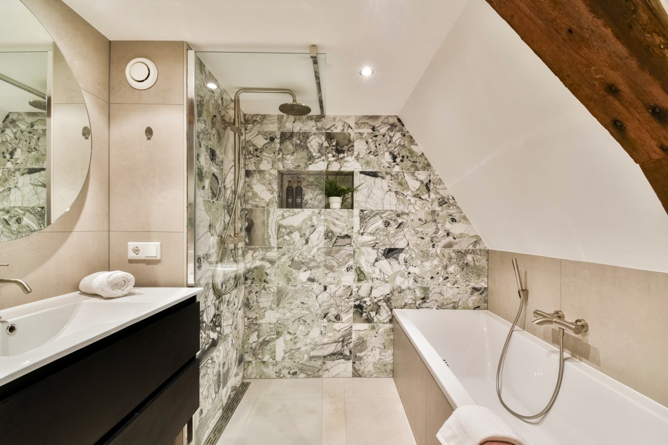 On the fourth floor there are two bedrooms, one of which features a mezzanine/loft sleeping area. Thanks to the high ceilings, both rooms feel especially spacious. One of the bedrooms provides access to the sunny roof terrace. The bathroom is equipped with a bathtub, walk-in shower, washbasin with vanity unit, and toilet.