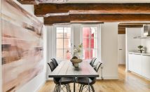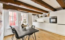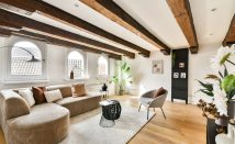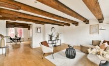 The apartment is located in the rear building on the third floor. It features a beautiful living room with an open kitchen. The charming exposed beams and the real wooden floor add warmth and allow the character of the home to truly stand out.
