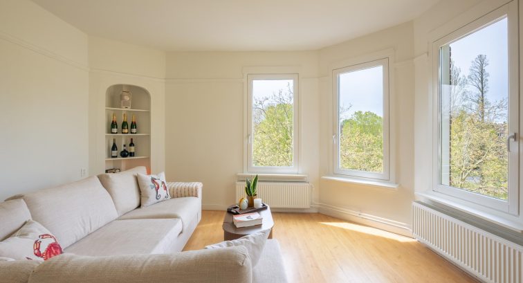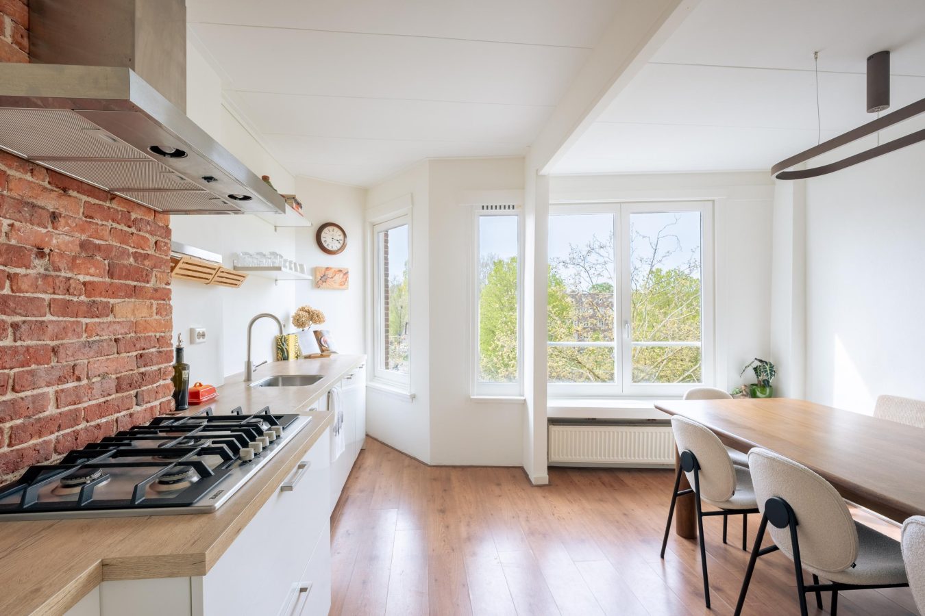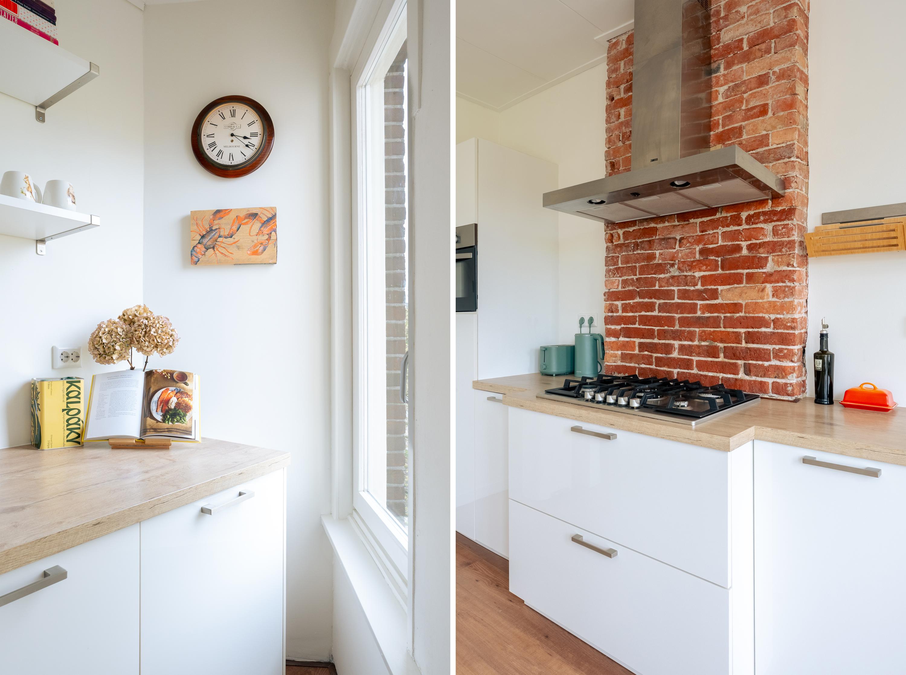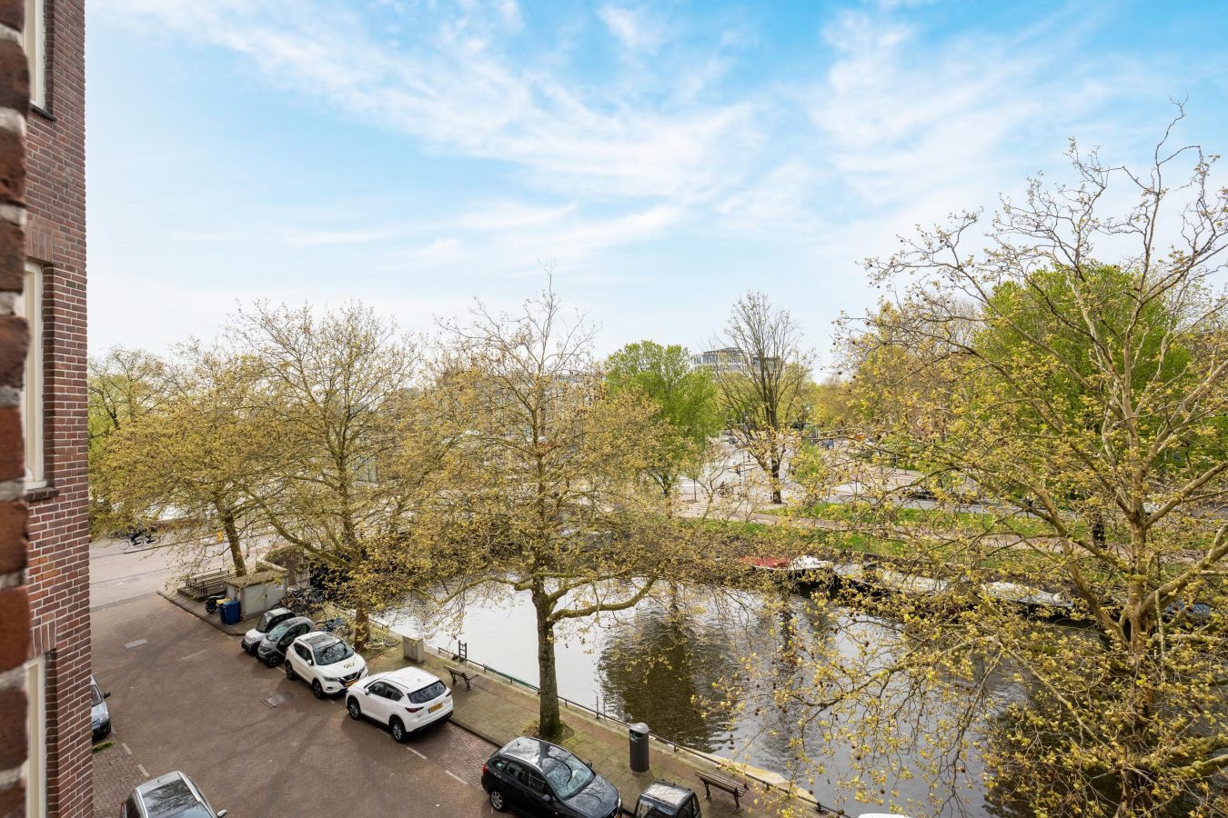 The apartment is located on the third floor of a well-maintained building. The living room is at the front, as is the spacious kitchen, which is equipped with all modern conveniences, including a fridge with freezer compartment, dishwasher, combi-oven and a 5-burner gas stove. The large west-facing windows in both the living room and kitchen allow for an abundance of natural light and offer a beautiful, unobstructed view of the Boerenwetering canal, letting you enjoy the evening sun and the surroundings to the fullest.