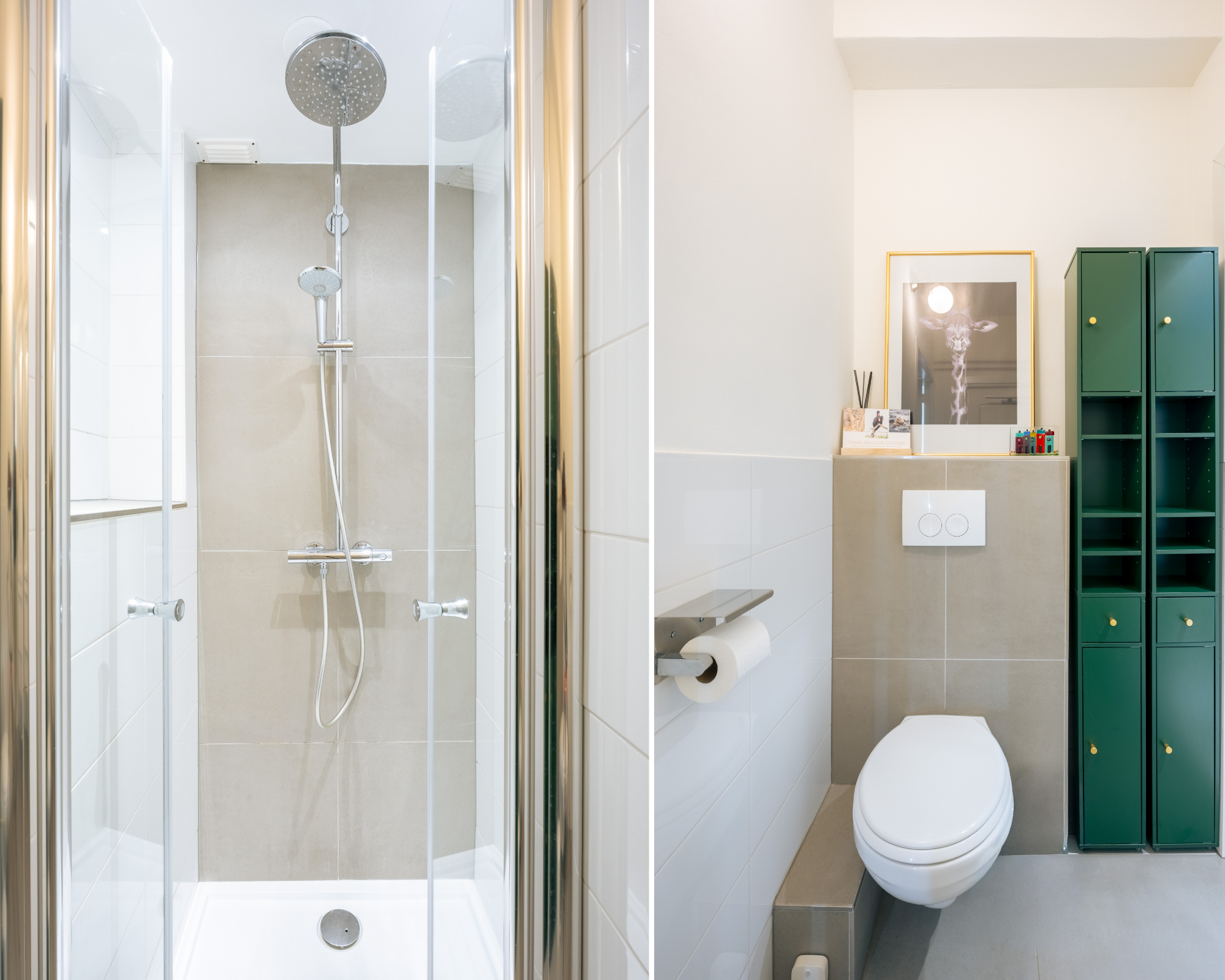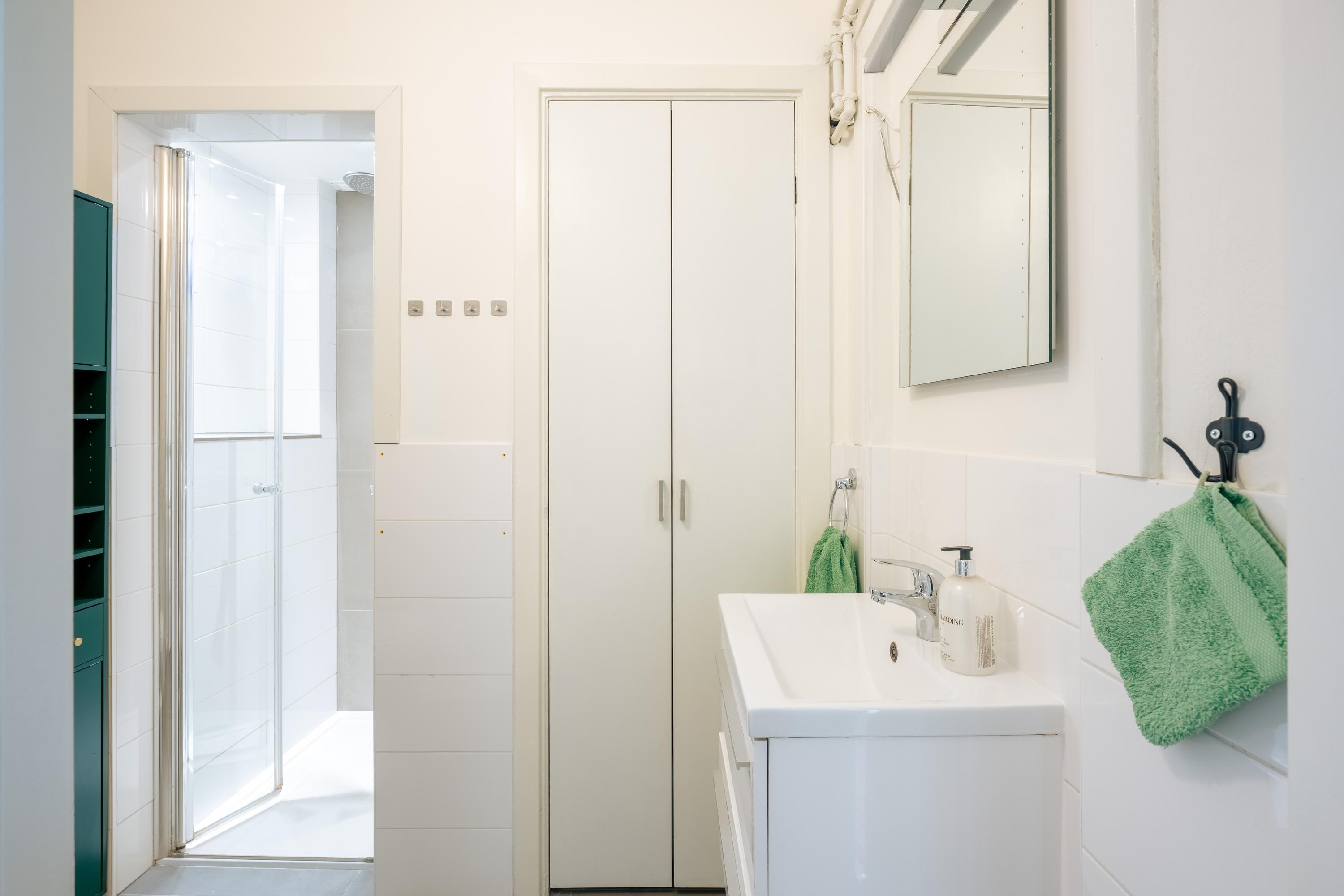De moderne badkamer beschikt over een inloopdouche, toilet en een wastafel met meubel. Ook is de wasmachine hier netjes weggewerkt. In het trappenhuis zijn bovendien extra kasten aanwezig die dienen als praktische bergruimte.