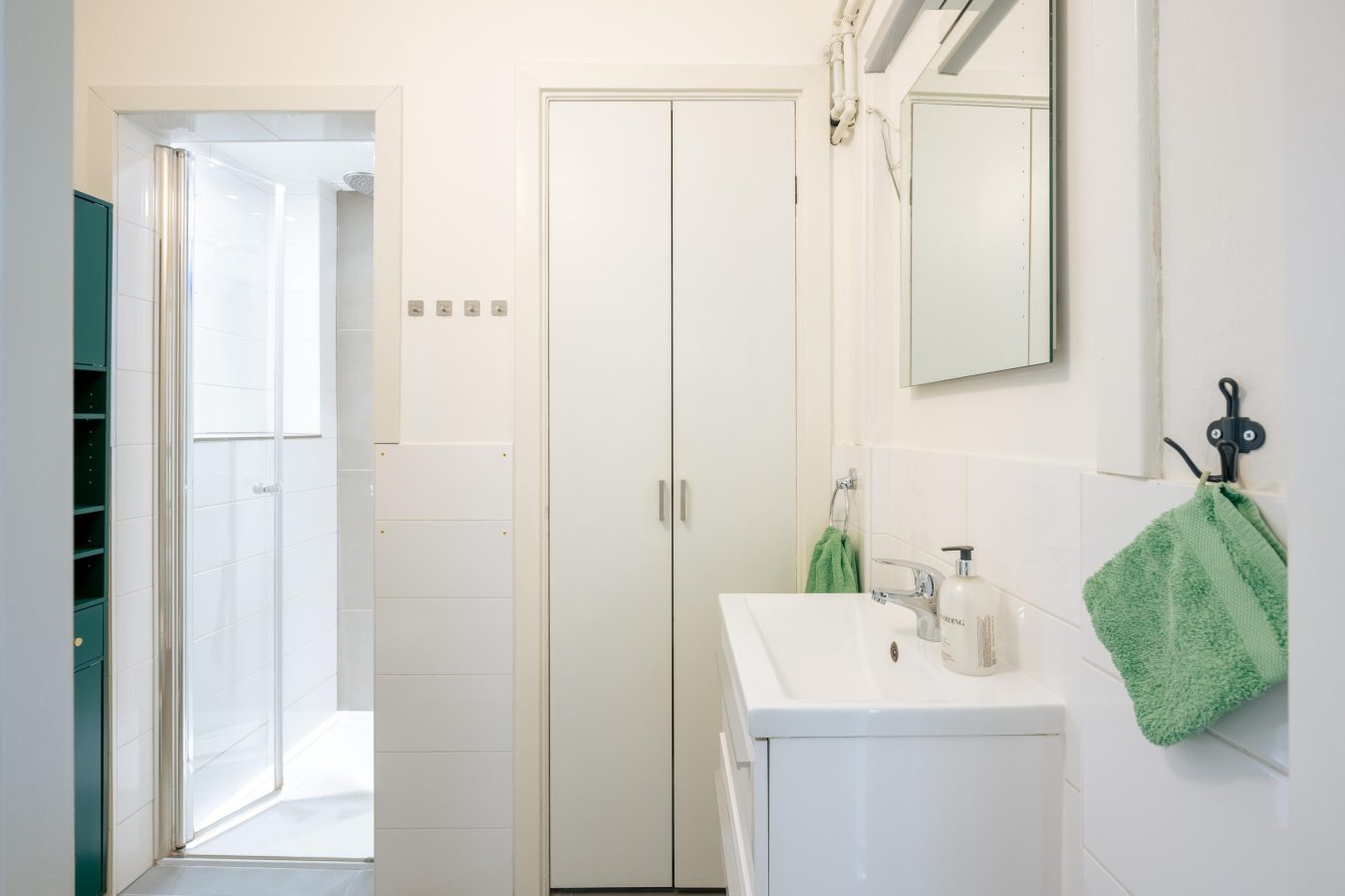 The modern bathroom features a walk-in shower, toilet, and vanity unit. The washing machine is neatly integrated. The stairwell also contains extra storage cupboards, offering practical storage space.