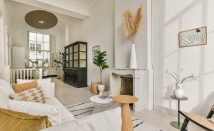The main-floor features a spacious living area with open kitchen and an impressive four-meter-high ceiling, allowing light and space to truly shine. The room boasts beautifully ornamented ceilings, a marble fireplace, and large traditional windows with original detailing.