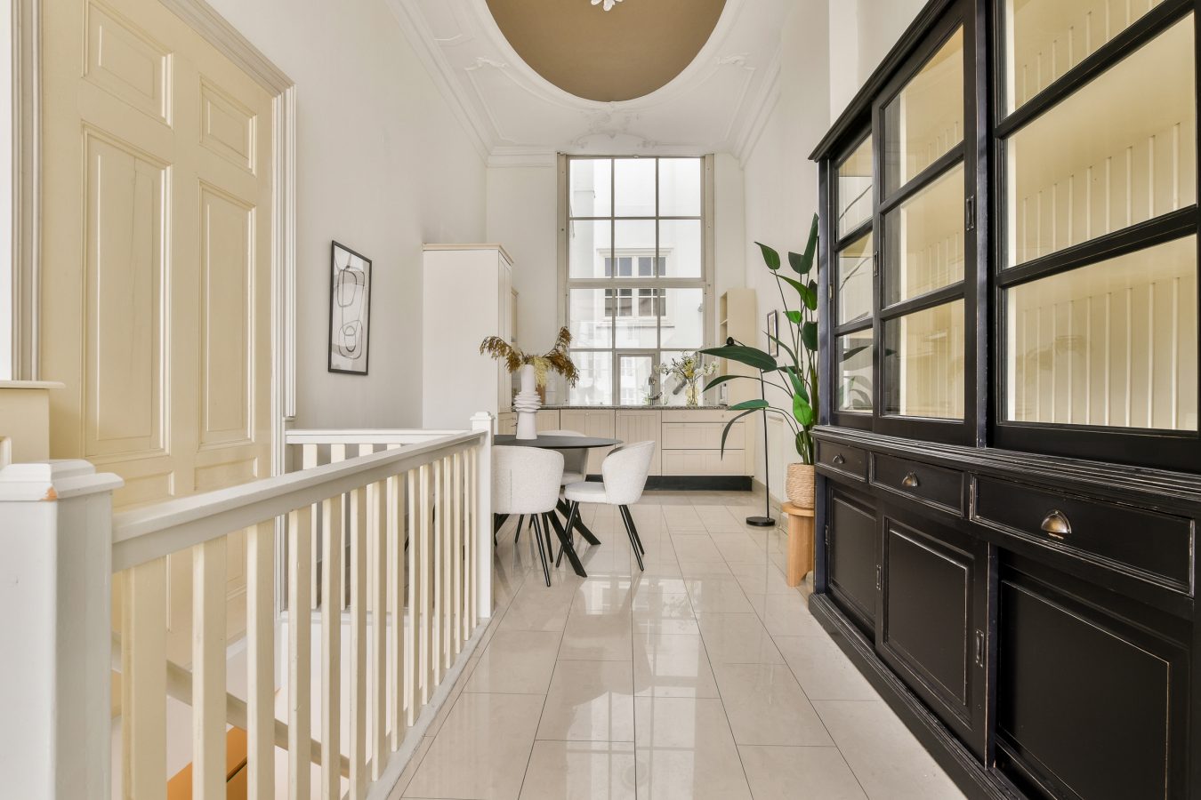This stylish apartment, measuring a total of 104 m², is spread over two floors and forms part of the national monument ’t Oxhoofd (1750) – a property with a rich past as a ladies’ hat factory, social club, and private residence. Entering through the impressive double staircase and the beautifully decorated marble entrance hall, you immediately feel the grandeur of bygone times combined with modern comfort.