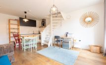 Accessible via a fixed staircase from the living room, you’ll find the bedroom and bathroom. The bathroom is equipped with a granito floor, steam shower cabin, bathtub, designer washbasin, and a washing machine connection.
