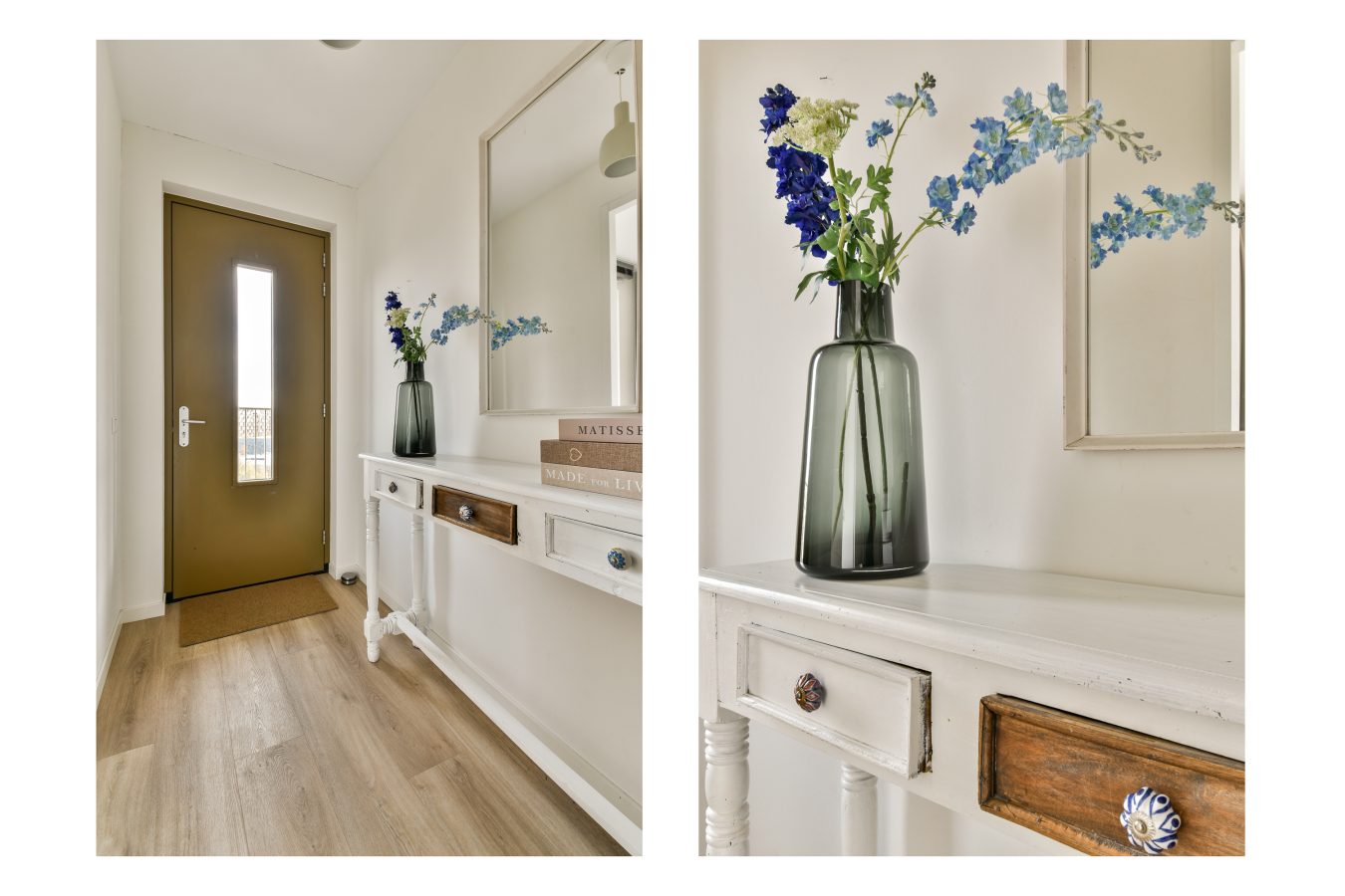 The apartment is located on the fifth floor and features an entrance hall, a bright living room, and a modern fully equipped kitchen. Large floor-to-ceiling windows allow for plenty of natural light throughout the day. From the living room, you have direct access to the sunny west-facing balcony, where you can enjoy the evening sun. Since there are no balconies above, the space feels particularly open and spacious.