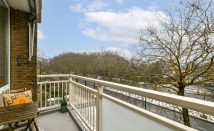 Ruime hal met separaat toilet en bergruimte. Lichte L-vormige woonkamer met open haard en toegang tot het zonnige balkon op het zuidwesten. Aangrenzende open zijruimte, ideaal als eet- of werkplek, maar ook eenvoudig om te vormen tot een tweede slaapkamer. Keuken met veel kastruimte, diverse inbouwapparatuur en toegang tot het oostelijk gelegen balkon. Ruime slaapkamer met vaste kastenwand. Badkamer met ligbad/douche en fontein.