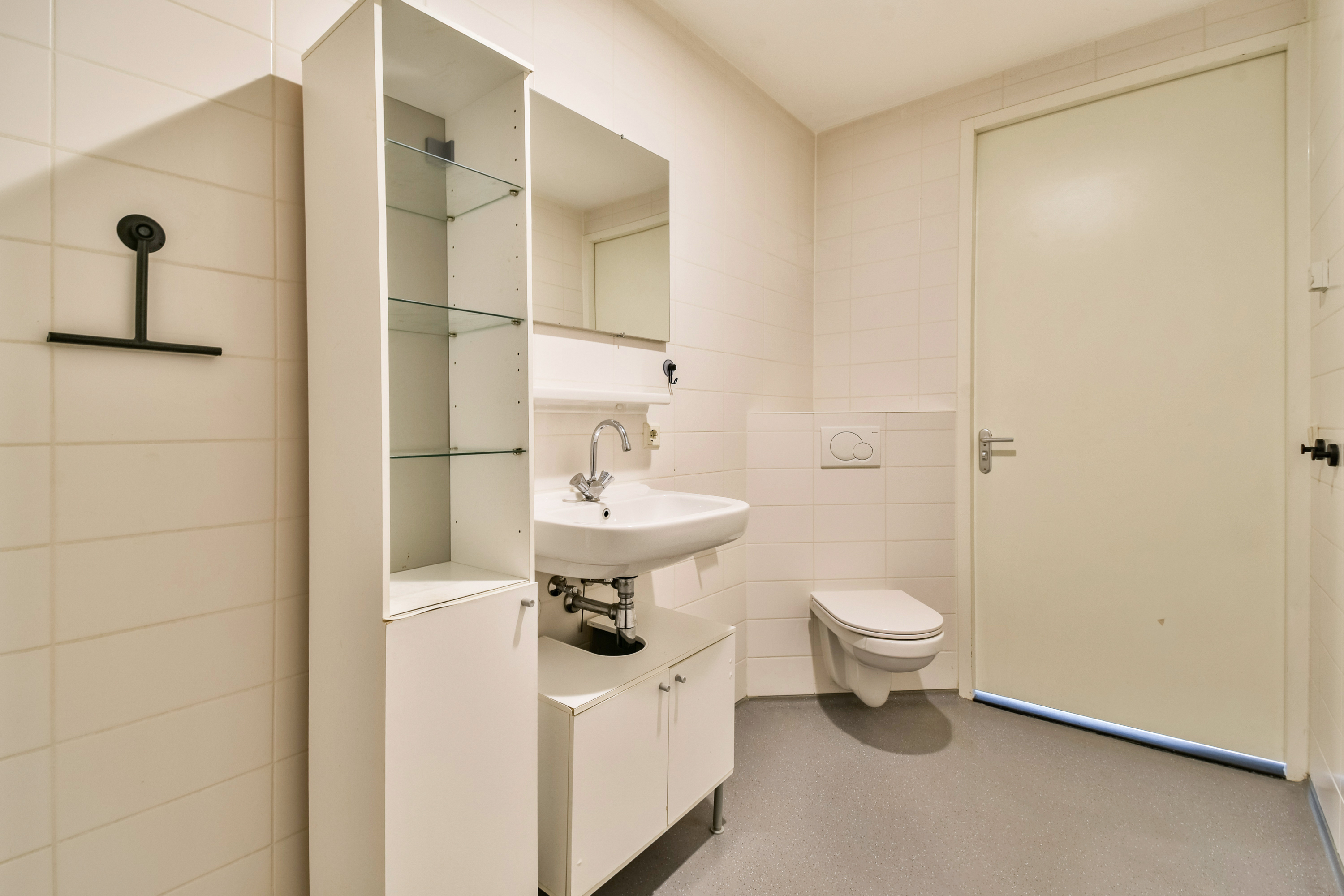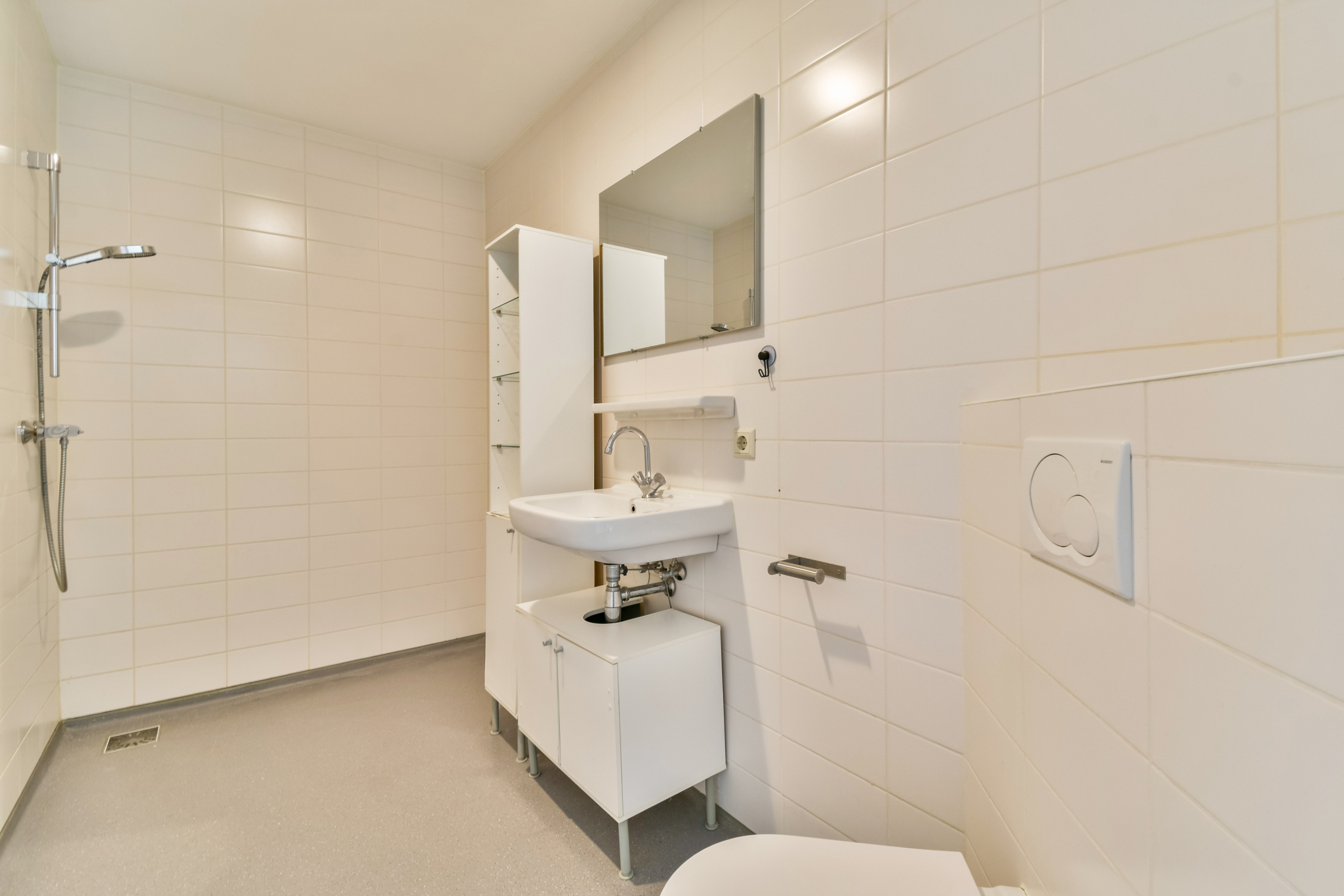 De ruime badkamer is compleet uitgerust met een wastafel, inloopdouche en toilet. Daarnaast is er een aparte berging met wasmachine-aansluiting, wat zorgt voor extra praktische bergruimte.