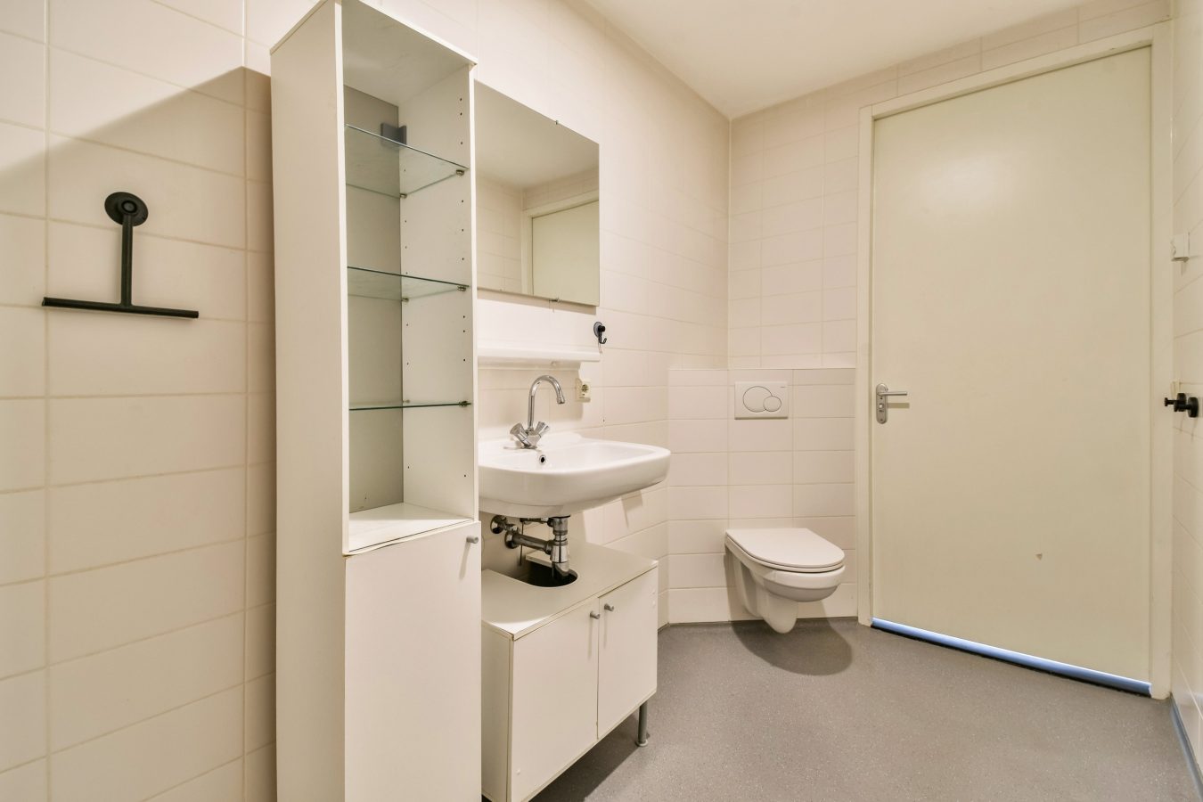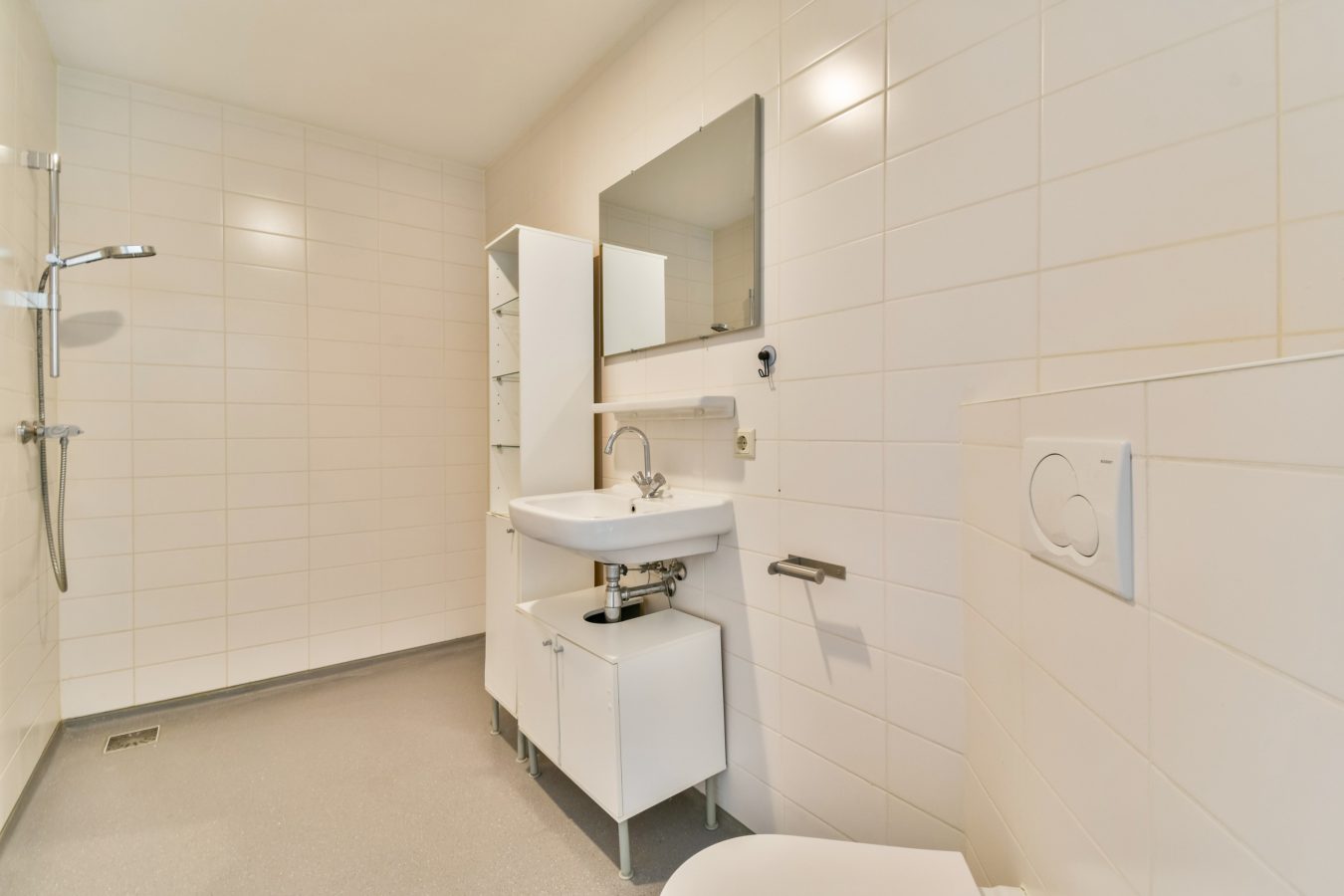 The spacious bathroom is fully equipped with a sink, walk-in shower, and toilet. There is also a separate storage room with a washing machine connection, providing additional practical storage space.