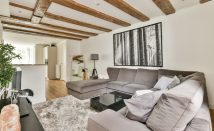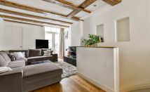 The apartment features a private entrance, immediately creating a sense of independence and privacy. The spacious living room, with an open-plan kitchen at the front and a beautiful view of the canal, is located on the first floor. The beamed ceilings, tall windows, and refined finishes create a pleasant sense of spaciousness and a serene atmosphere.