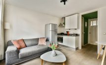 The apartment boasts an ideal layout: a bright living room with an open-plan kitchen and a great view on the pleasant, quiet street. The kitchen is fully equipped with a dishwasher, combination oven, and a freestanding SMEG fridge/freezer. The neat bathroom has a shower, toilet, and sink.