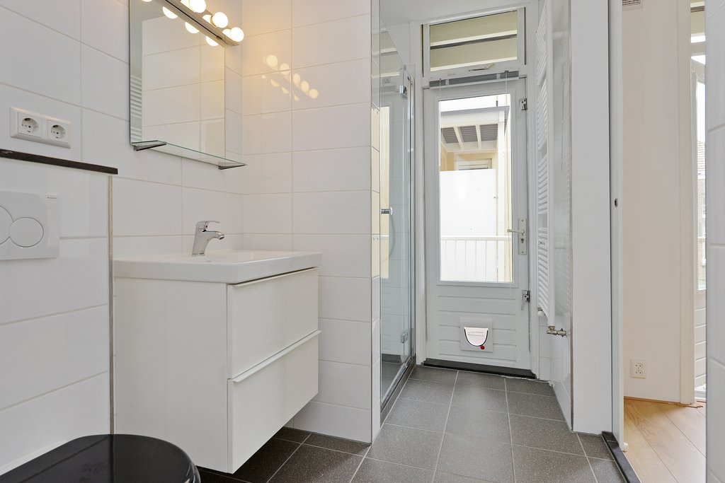 Aan de achterzijde liggen de goed ingedeelde badkamer, voorzien van toilet, wastafel met meubel en douche, en de ruime slaapkamer. Vanuit zowel de badkamer als de slaapkamer is het zonnige balkon op het zuiden bereikbaar.