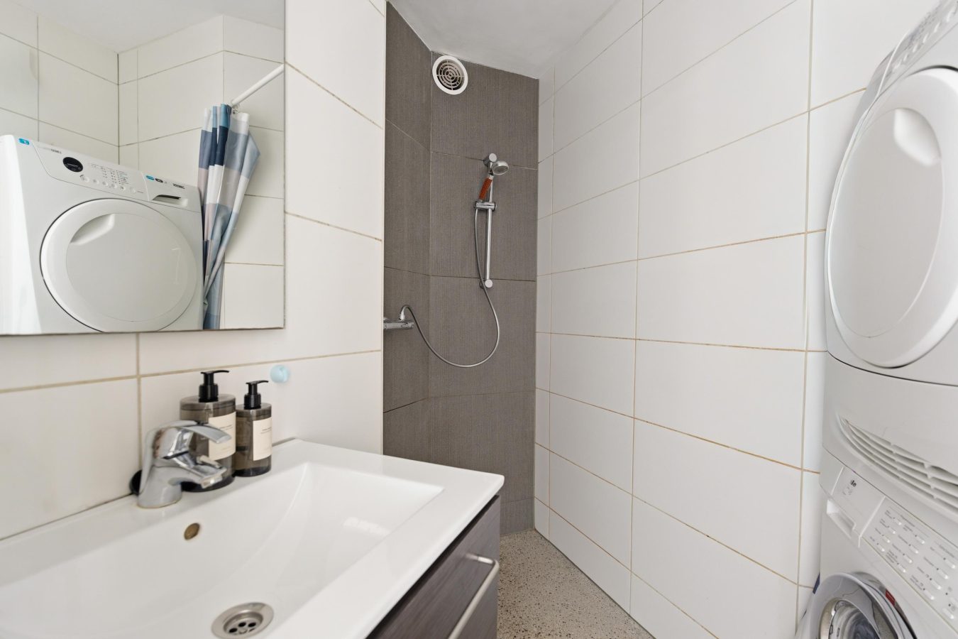 The bathroom is well-maintained and functional, featuring a washbasin, shower, and space for a washing machine and dryer. A separate toilet provides additional convenience. At the quiet rear side of the apartment is the spacious master bedroom, with access to the second balcony, ideal for a peaceful moment outdoors.