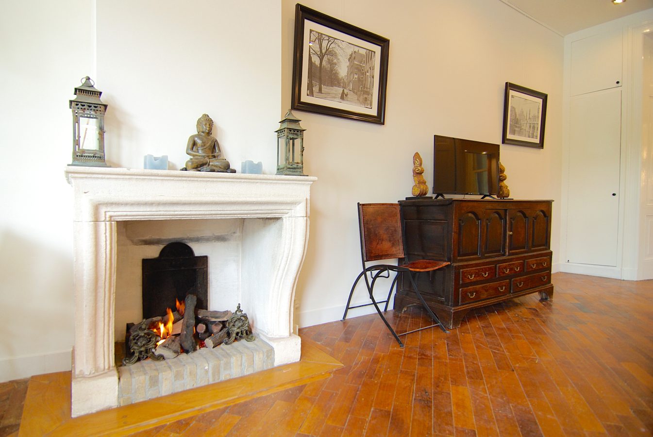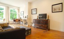 Bij binnenkomst valt direct de elegante sfeer op: de ruim 3 meter hoge plafonds, de originele en-suite deuren, de fraaie parketvloer en de warme uitstraling van de (gas) open haard geven de woonkamer een tijdloze klasse. De erker aan de voorzijde biedt een schitterende lichtinval en een karakteristiek uitzicht.