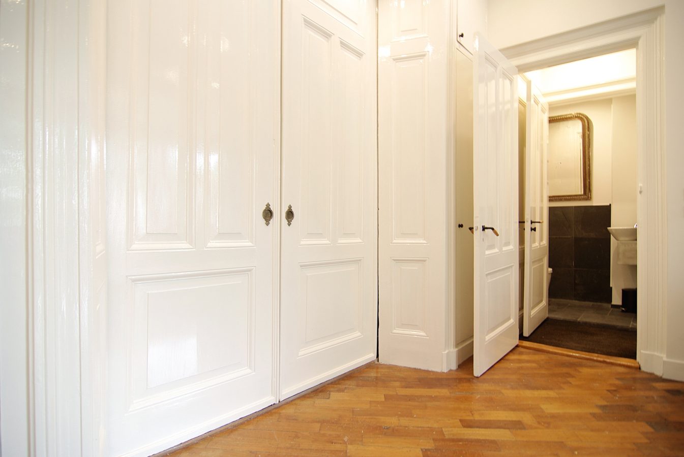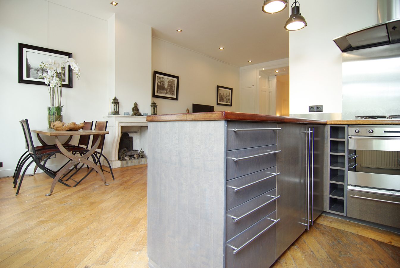 Upon entering, the elegant atmosphere is immediately noticeable: the over 3-meter-high ceilings, the original en-suite doors, the beautiful parquet flooring, and the warm glow of the (gas) fireplace give the living room a timeless touch of class. The bay window at the front offers beautiful light and a characteristic view.