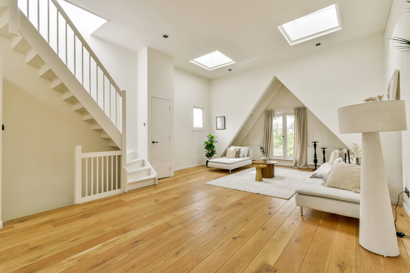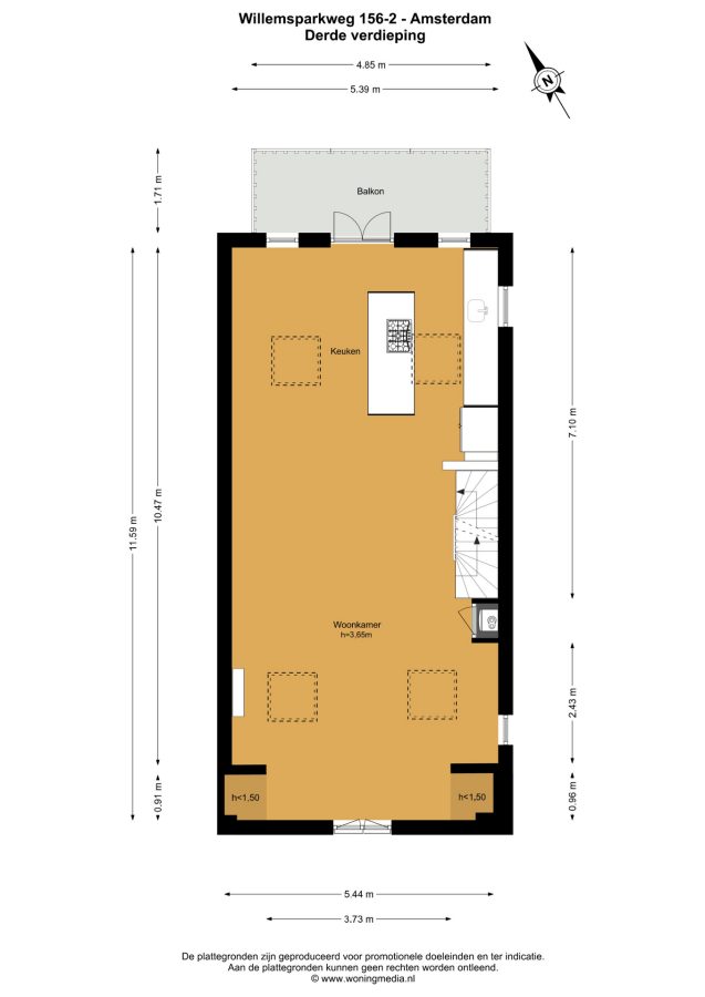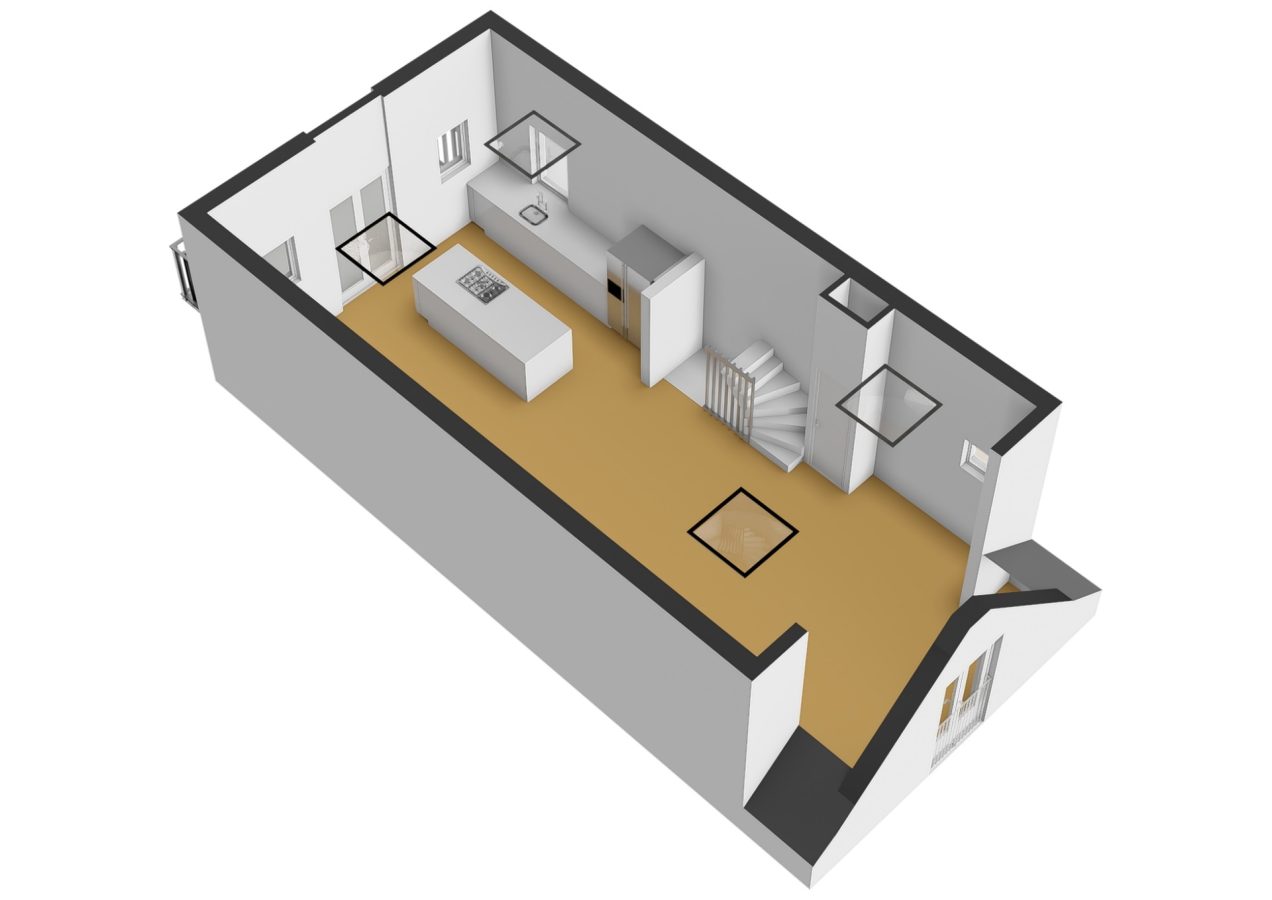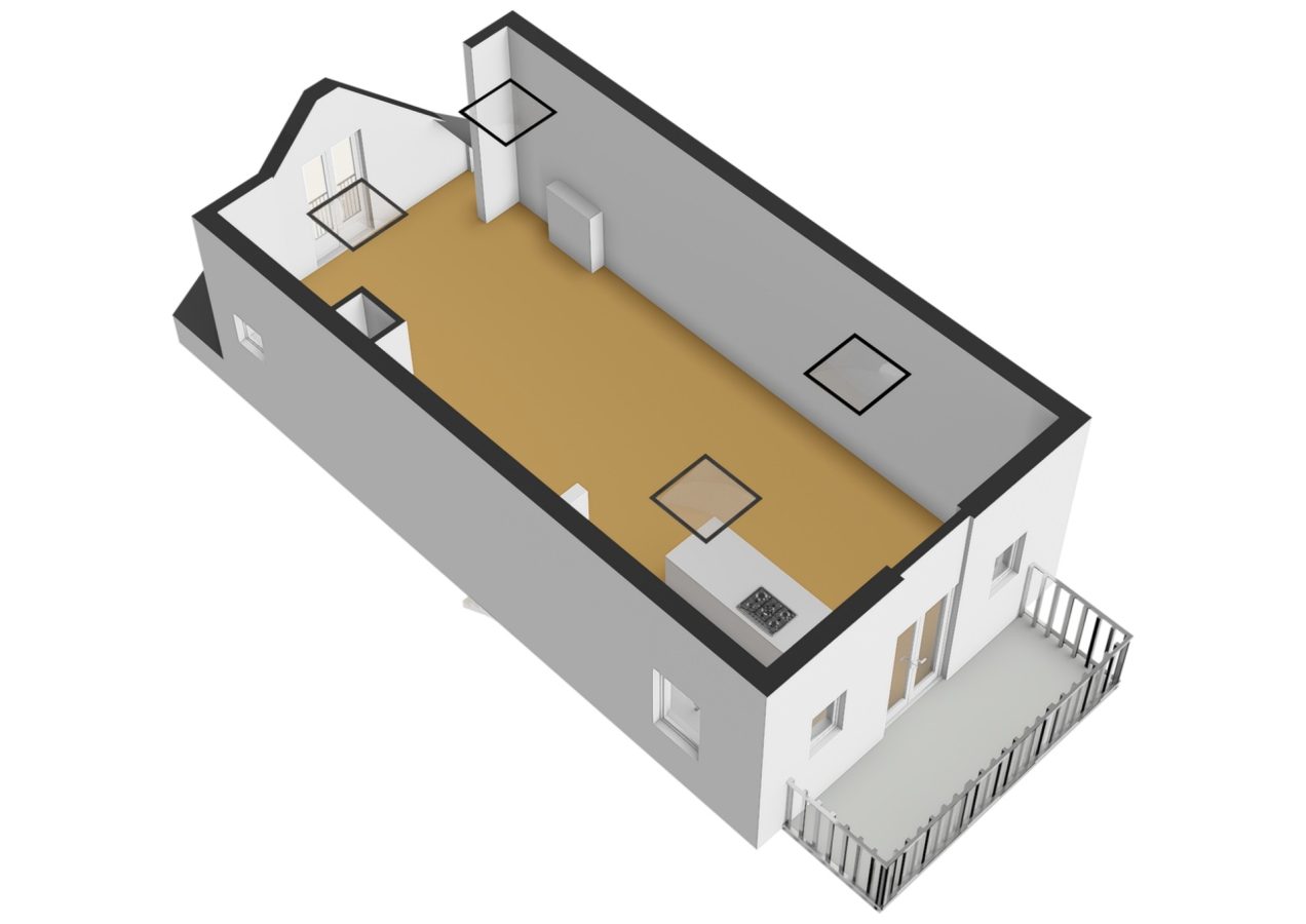 The third and top floor comprises a spacious open-plan living area of approximately 61 m², with a ceiling height of over 3.5 meters (!), four skylights, a French balcony at the front, and an adjoining balcony of approximately 8.3 m² at the rear. An open-plan kitchen with a cooking island is equipped with all built-in appliances, including a Quooker, though the kitchen is a bit aged.