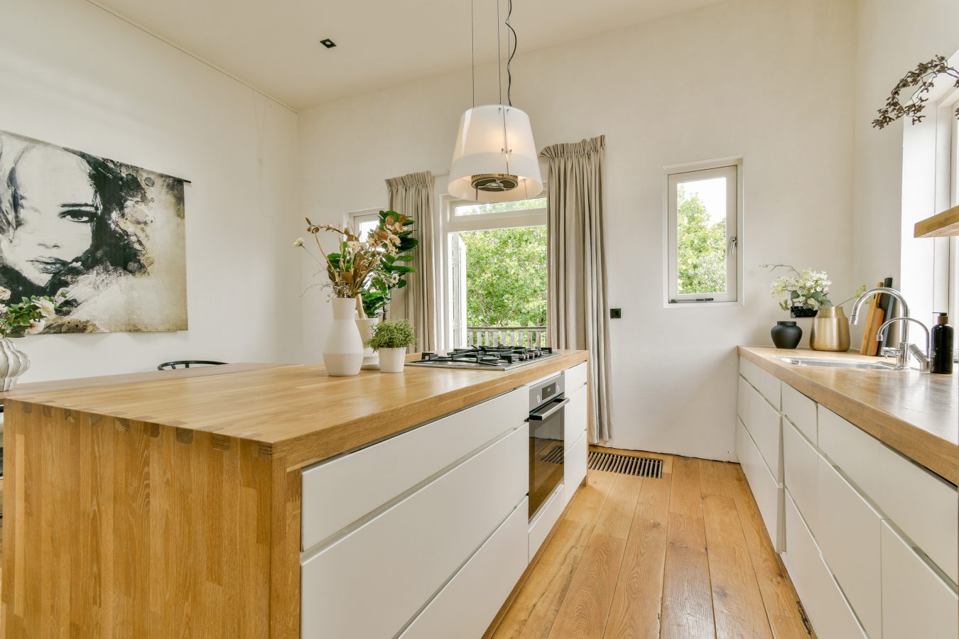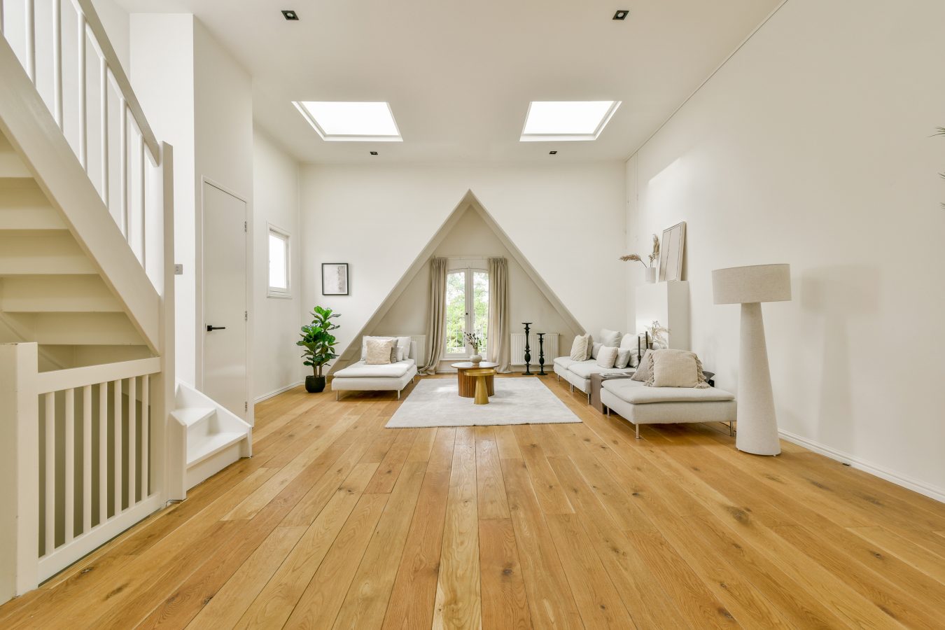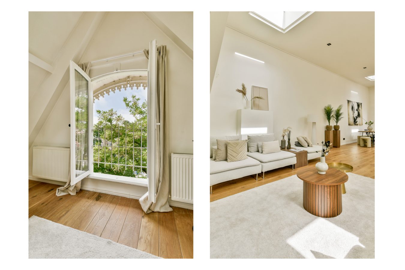 The third and top floor comprises a spacious open-plan living area of approximately 61 m², with a ceiling height of over 3.5 meters (!), four skylights, a French balcony at the front, and an adjoining balcony of approximately 8.3 m² at the rear. An open-plan kitchen with a cooking island is equipped with all built-in appliances, including a Quooker, though the kitchen is a bit aged.