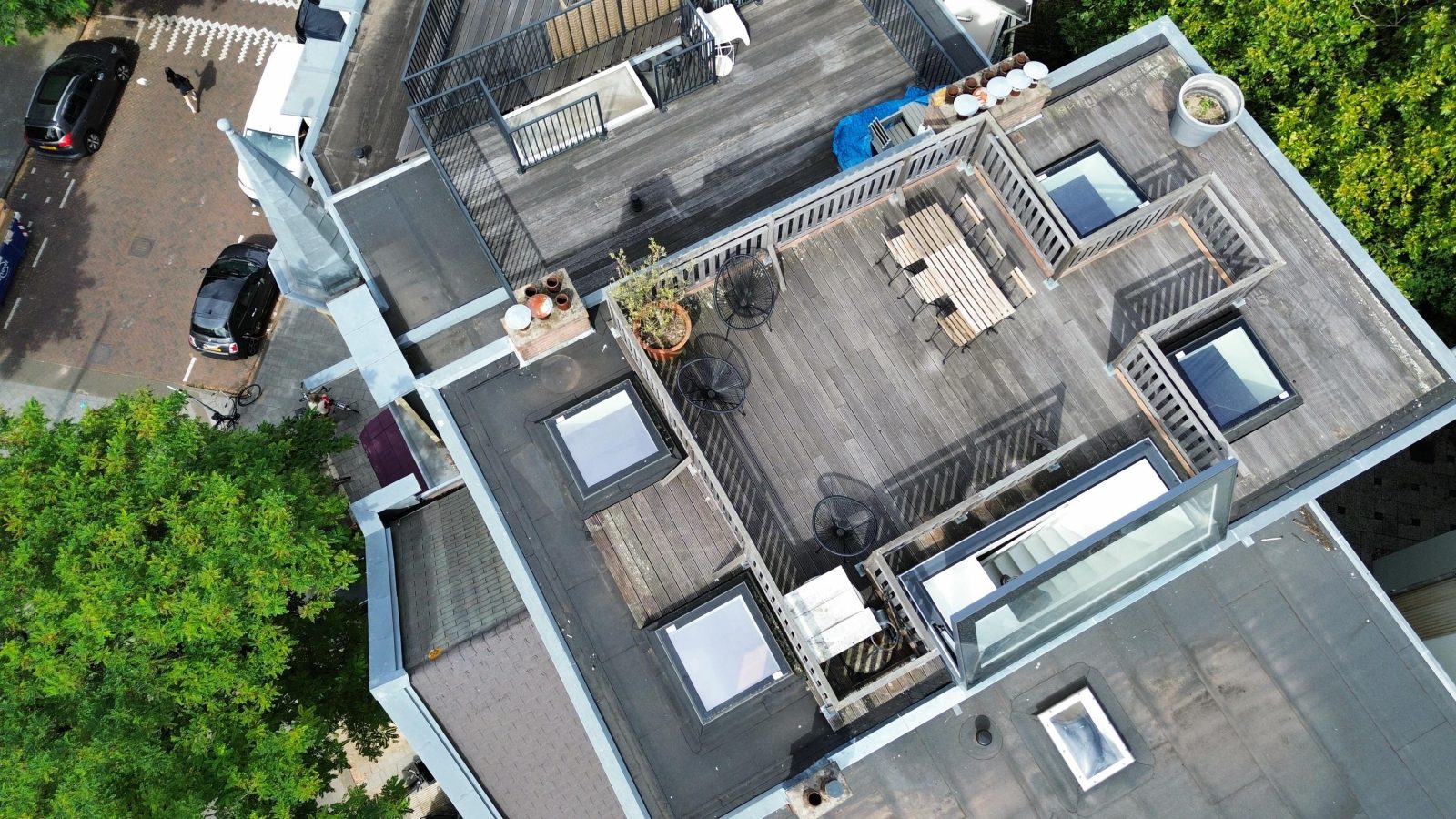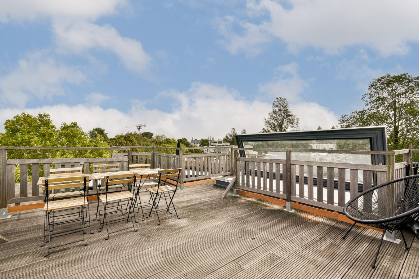 Vanuit de woonkamer leidt een vaste trap en een elektrisch bedienbaar dakluik naar het dakterras, waar je kunt genieten van een prachtig uitzicht en heerlijke zomers met familie en vrienden.